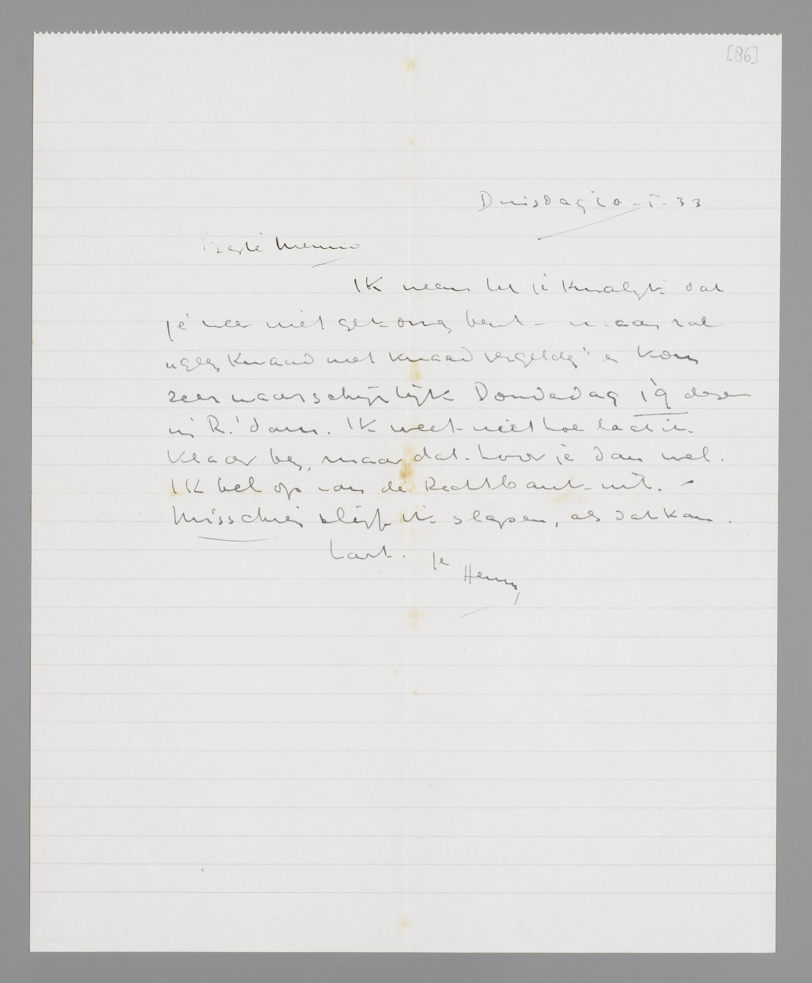 Ik neem het je kwalijk dat je niet gekomen bent maar zal geen kwaad met kwaad vergelden en kom zeer waarschijnlijk Donderdag 19 dezer in R'dam. Ik weet niet hoe laat ik klaar ben, maar dat hoor je dan wel. Ik bel op van de Rechtbank uit. Misschien blijf ik slapen, als dat kan.