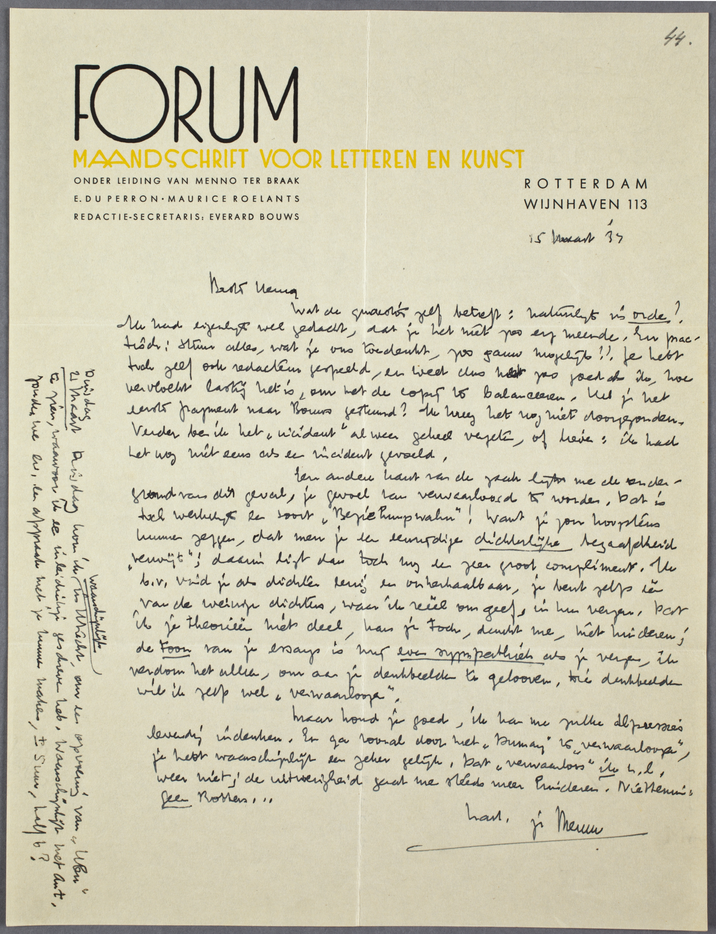 Wat de quaestie zelf betreft: natuurlijk in orde! Ik had eigenlijk wel gedacht, dat je het niet zoo erg meende. En practisch: stuur alles, wat je ons toedenkt, zoo gauw mogelijk!! Je hebt toch zelf ook redacteur gespeeld, en weet dus zoo goed als ik, hoe vervloekt lastig het is, om met de copy te balanceeren. Heb je het eerste fragment naar Bouws gestuurd? Ik kreeg het nog niet doorgezonden. Verder ben ik het ‘incident’ al weer geheel vergeten, of liever: ik had het nog niet eens als incident gevoeld.