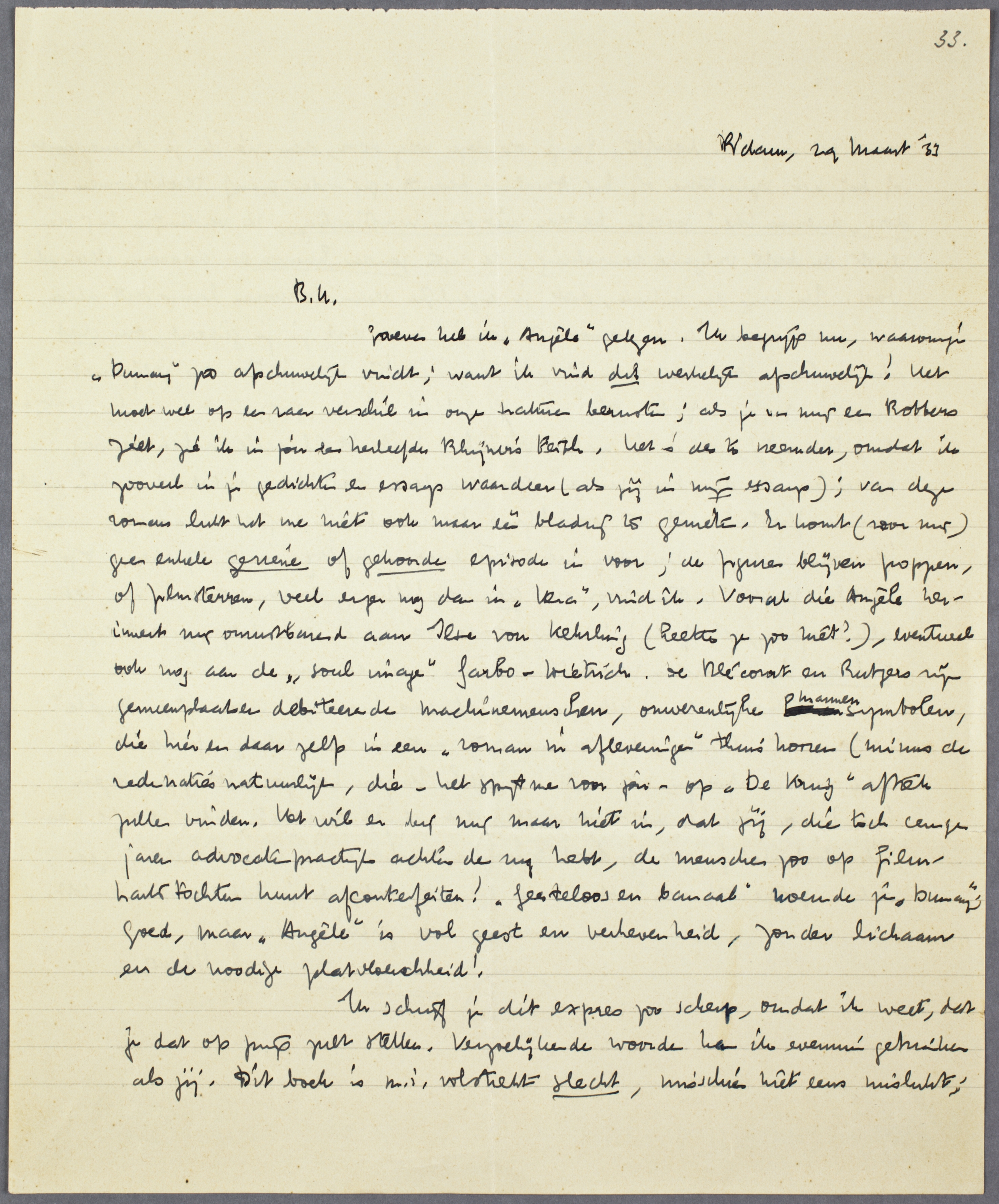 Zooeven heb ik ‘Angèle’ gekregen. Ik begrijp nu, waarom je ‘Dumay’ zoo afschuwelijk vindt; want ik vind dit werkelijk afschuwelijk! Het moet wel op een raar verschil in onze naturen berusten; als je in mij een Robbers ziet, zie ik in jou een herleefden Rhijnvis Feith. Het is des te vreemder, omdat ik zooveel in je gedichten en essays waardeer (als jij in mijn essays); van deze roman lukt het me niet ook maar één bladzij te genieten. Er komt (voor mij) geen enkele geziene of gehoorde episode in voor; de figuren blijven poppen, of filmsterren, veel erger nog dan in ‘Vera’, vind ik. Vooral die Angèle herinnert mij onrustbarend aan Ilse von Kehrling (heette ze zoo niet?), eventueel ook nog aan de ‘soul-image’ Garbo-Dietrich. De Blécourts en Rutgers zijn gemeenplaatsen debiteerende machinemenschen, onwezenlijke mannensymbolen, die hier en daar zelfs in een ‘roman in afleveringen’ thuis hooren (minus de redenaties natuurlijk, die - het spijt me voor jou - op ‘De Kring’ aftrek zullen vinden. Het wil er bij mij maar niet in, dat jij, die toch eenigen jaren advocatenpractijk achter de rug hebt, de menschen zoo op filmhartstochten kunt [afconterfeiten]! ‘Geesteloos en banaal’ noemde je ‘Dumay’. Goed, maar ‘Angèle’ is vol geest en verhevenheid, zonder lichaam en de noodige platvloerschheid!