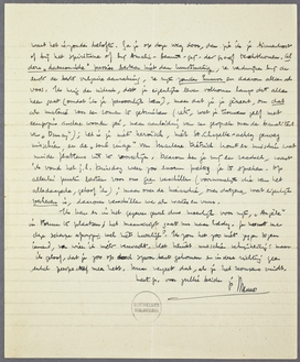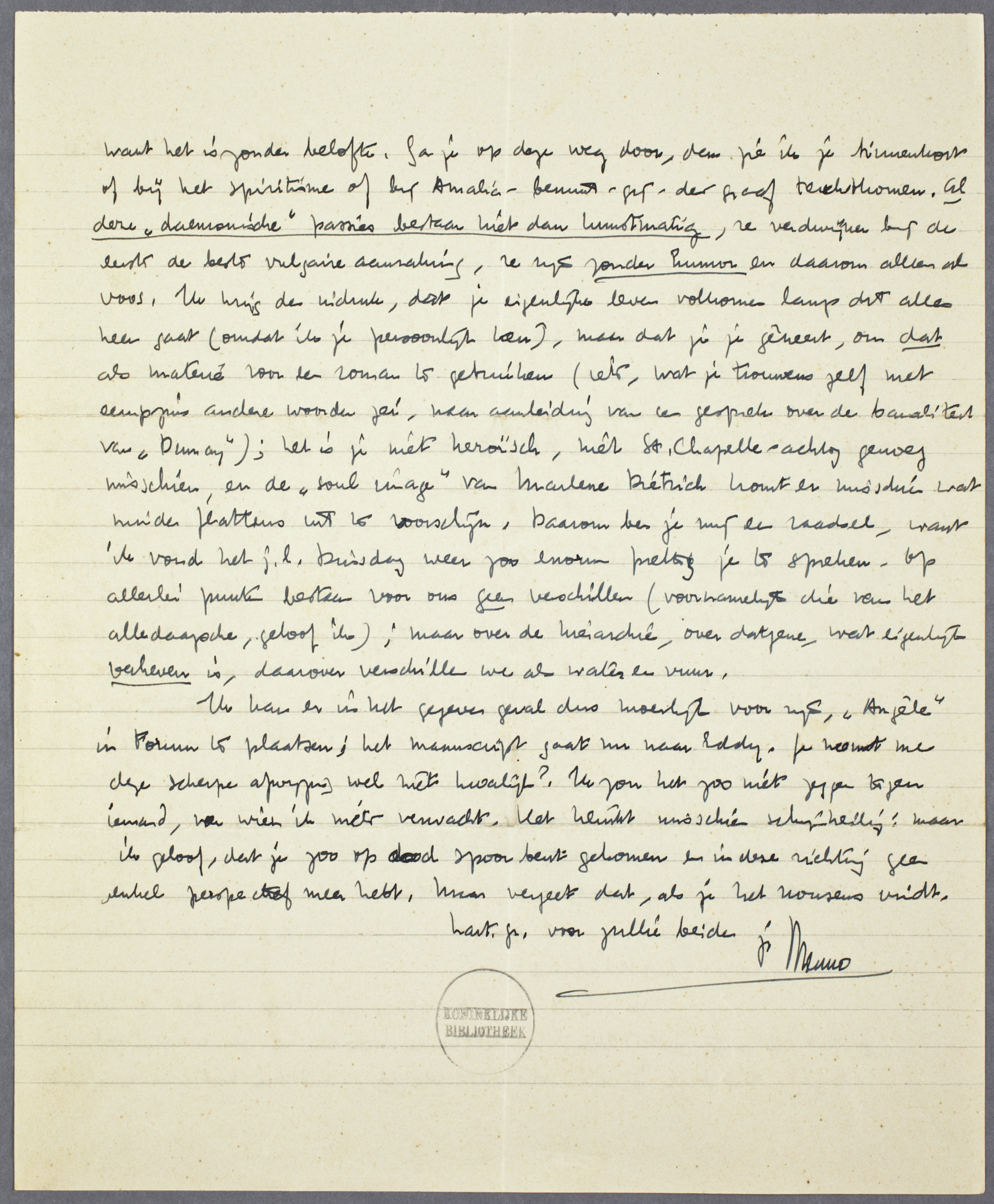 Ik schrijf je dit expres zoo scherp, omdat ik weet, dat je dat op prijs zult stellen. Vergoelijkende woorden kan ik evenmin gebruiken als jij. Dit boek is m.i. volstrekt slecht, misschien niet een mislukt, want het is zonder belofte. Ga je op deze weg door, dan zie ik je binnenkort of bij het spiritisme of bij Amalia-bemint-gij-den Graaf terechtkomen. Al deze ‘daemonische’ passies bestaan niet dan kunstmatig, ze verdwijnen bij de eerste de beste vulgaire aanraking, ze zijn zonder humor en daarom alleen al voos. Ik krijg den indruk, dat je eigenlijke leven volkomen langs dit alles heen gaat (omdat ik je persoonlijk ken), maar dat je je gêneert, om dat als materie voor een roman te gebruiken (iets, wat je trouwens zelf met eenigszins andere woorden zei, naar aanleiding van een gesprek over de banaliteit van ‘Dumay’); het is je niet heroïsch, niet St. Chapelle-achtig genoeg misschien, en de ‘soul image’ van Marlene Dietrich komt er misschien wat minder flatteus uit te voorschijn. Daarom ben je mij een raadsel, want ik vond het j.l. Dinsdag weer zoo enorm prettig je te spreken. Op allerlei punten bestaan voor ons geen verschillen (voornamelijk die van het alledaagsche, geloof ik); maar over de hierarchie, over datgene, wat eigenlijk verheven is, daarover verschillen we als water en vuur.