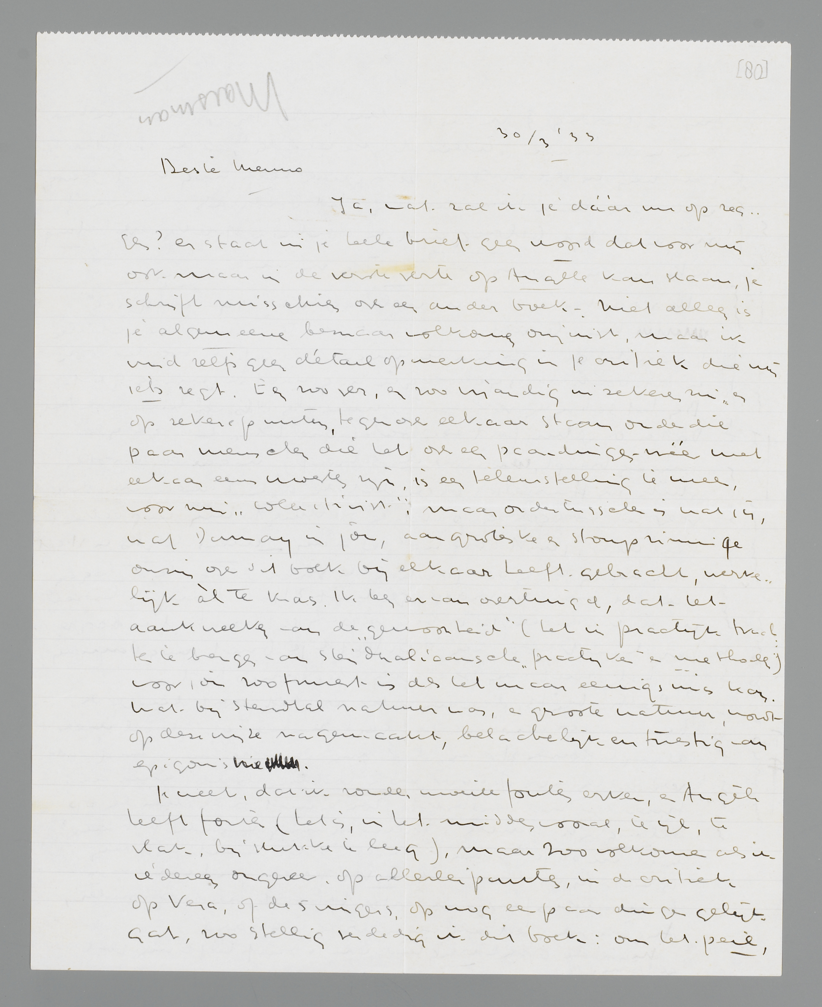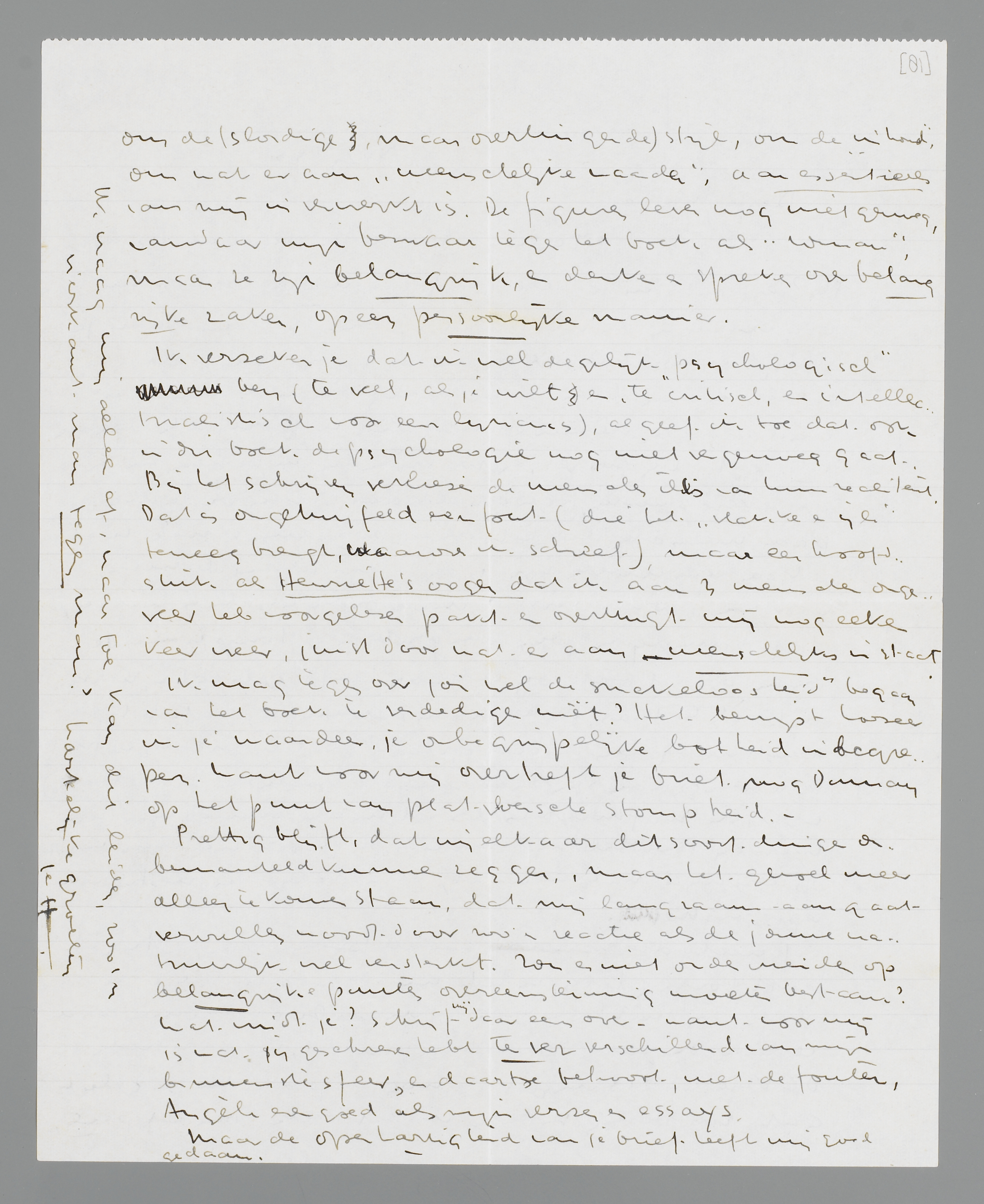 Ik verzeker je dat ik wel degelijk ‘psychologisch’ ben (te veel, als je wilt en, te critisch, en intellectualistisch voor een lyricus), al geef ik toe dat ook in dit boek de psychologie nog niet ver genoeg gaat. Bij het schrijven verliezen de menschen iets van hun realiteit. Dat is ongetwijfeld een fout (die het ‘vlakke eigen’ teweeg brengt, waarover ik schreef), maar een hoofdstuk als Henriëtte's oogen dat ik aan 3 menschen ongeveer heb voorgelezen pakt en overtuigt mij nog elken keer weer, juist door wat er aan menschelijks in staat. Ik mag tegenover jou wel de ‘smakeloosheid’ begaan van het boek te verdedigen niet? Het bewijst hoezeer ik je waardeer, je onbegrijpelijke botheid inbegrepen. Want voor mij overtreft je brief nog Dumay op het punt van platvloersche stompheid. -