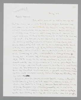 Je weet, dat ik zonder moeite fouten erken, en Angèle heeft fouten (het is, in het midden vooral, te ijl, te vlak, bij stukken te leeg), maar zoo volkomen als ik iedereen ongeveer, op allerlei punten, in de critiek op Vera, of de 5 vingers, op nog een paar dingen gelijk gaf, zoo stellig verdedig ik dit boek: om het peil, om de (slordige, maar overtuigende) stijl, om de ‘inhoud’, om wat er aan ‘menschelijke waarden’, aan essentieren van mij in verwerkt is. De figuren leven nog niet genoeg, vandaar mijn bezwaar tegen het boek als ‘roman’, maar ze zijn belangrijk, en denken en spreken over belangrijke zaken, op een persoonlijke manier.