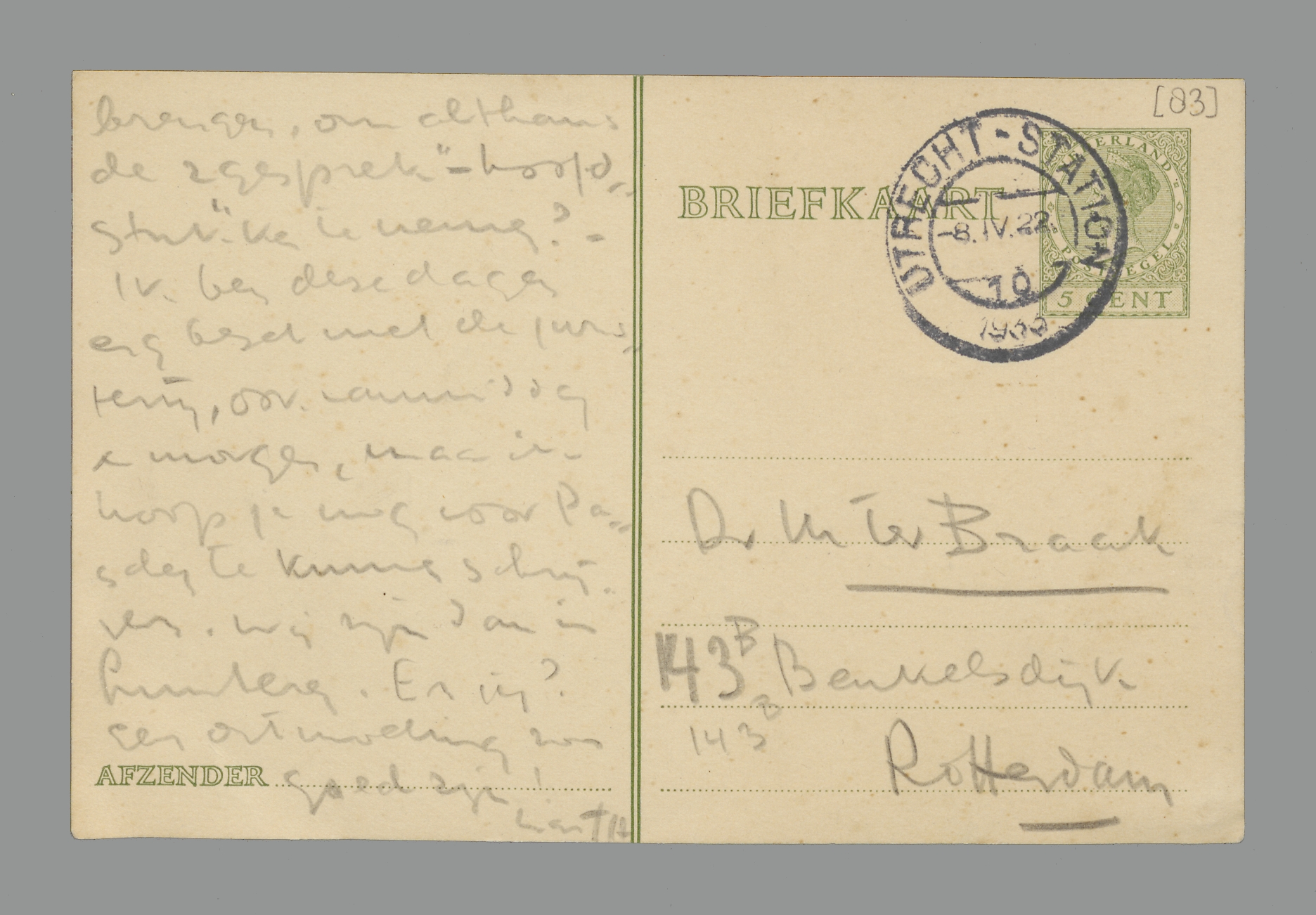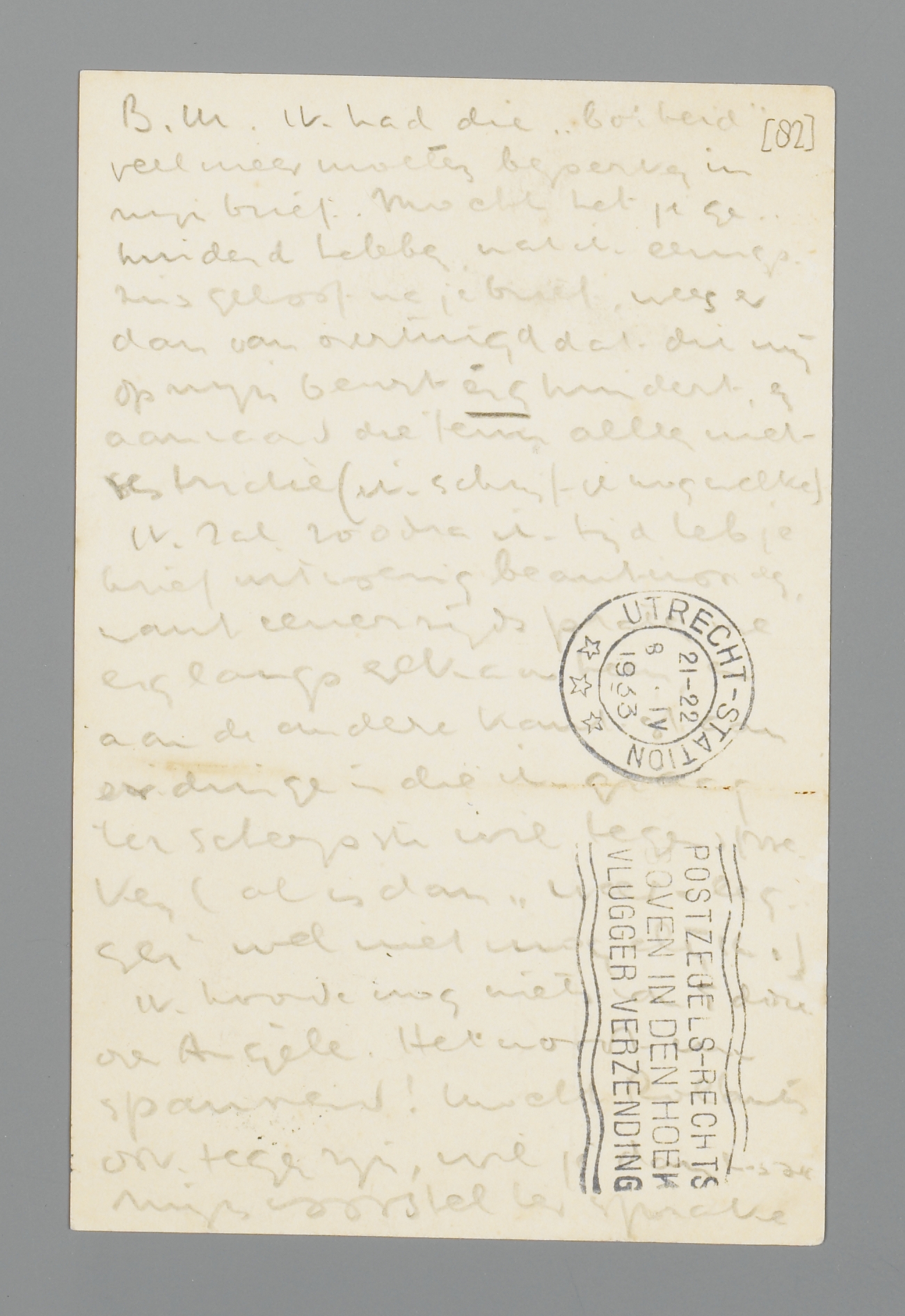 Ik ben deze dagen erg bezet met de juristerij, ook vanmiddag en morgen, maar ik hoop je nog voor Paschen te kunnen schrijven. Wij zijn dan in Lunteren. En jij? Een ontmoeting zou goed zijn!