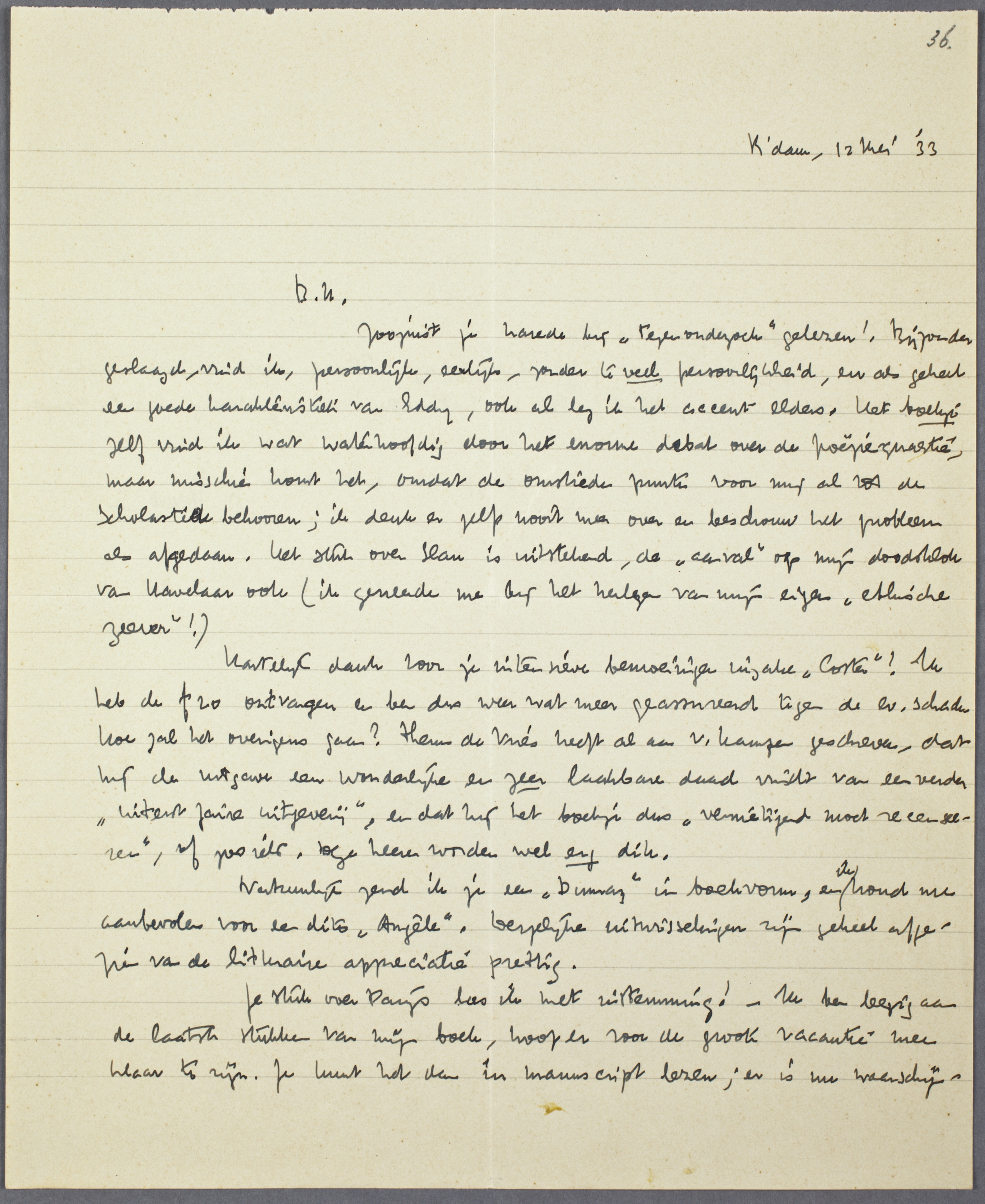 Hartelijk dank voor je intensieve bemoeiingen inzake ‘Coster’! Ik heb de 20 ontvangen en ben dus weer wat meer geassureerd tegen de ev. schade. Hoe zal het overigens gaan? Theun de Vries heeft al aan v. Kampen geschreven, dat hij de uitgave een wonderlijke en zeer laakbare daad vindt van een verder ‘uiterst faire uitgeverij’, en dat hij het boekje dus ‘vernietigend moet recenseeren’, of zooiets. Deze heeren worden wel erg dik.