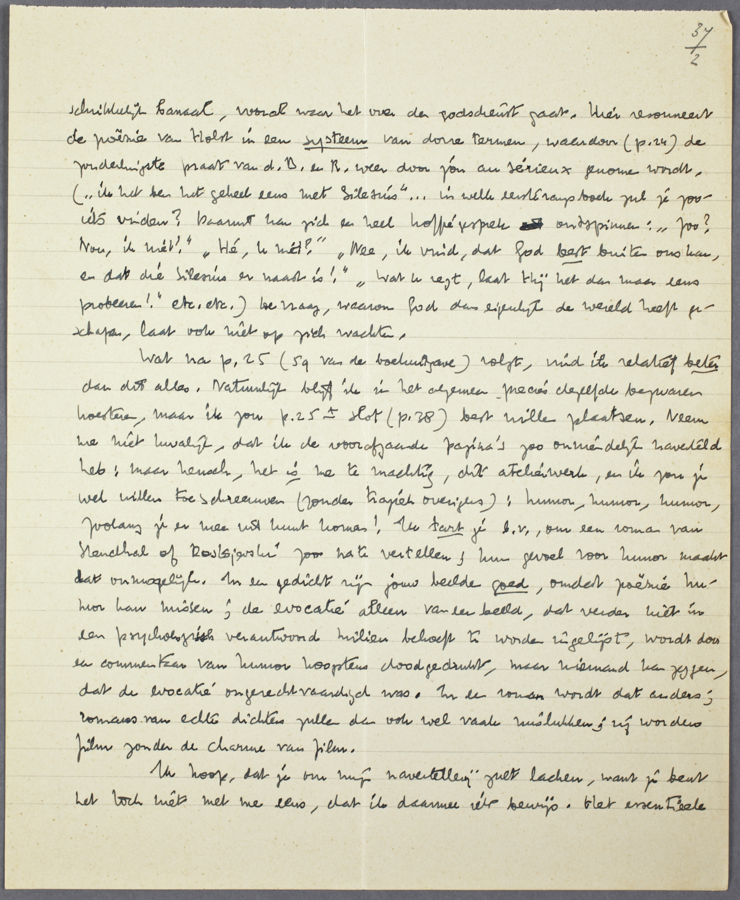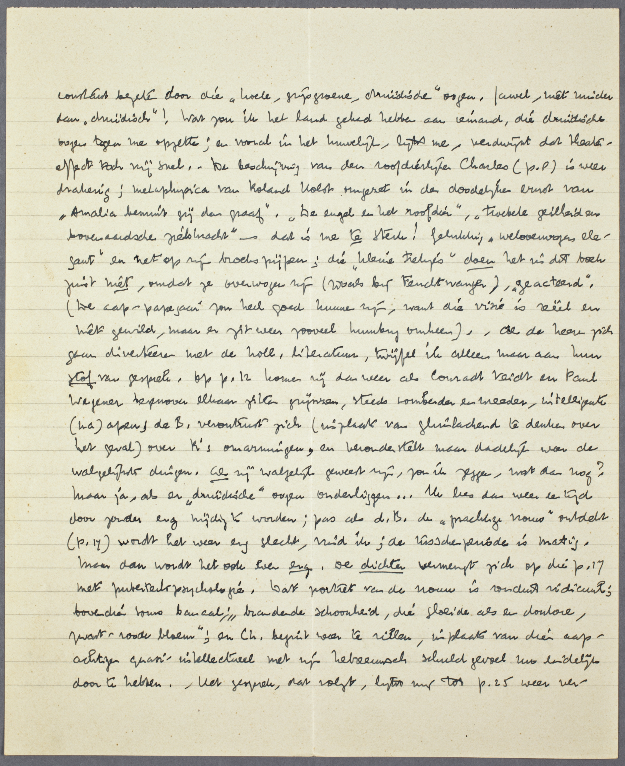 Nu heb ik ‘Henriëtte's oogen’ nog eens grondig (een paar maal) overgelezen. Ik moet je er eens over schrijven, want ik zit er mee, als redacteur in dit geval. Met de beste wil van de wereld kan ik er niets in vinden, dat me aantrekt, dat me iets anders zegt over je persoonlijkheid dan: hij verbergt zich achter een filmachtige retoriek. Je stijl in dit boek is gespeend van alle humor, dat vind ik eigenlijk het ergste. De lezer merkt, dat je de tragische Rutgers ook zelf zoo verbijsterd tragisch (‘Solemn’ gezien, om met den heer Hemmingway te spreken) hebt gevonden. Dadelijk al (p.1) die bibliotheek van R., absoluut drakerig, stuiversroman voor de betere klasse. Een man met zoo'n idiote bibliotheek wordt dan n.b. nog een ‘milde snelle intelligentie’ toegedicht! Alsof de eerste daad dien intelligentie niet geweest zou zijn, de boeken door elkaar te gooien en dat kabinet van dr. Caligari leeg te ruimen! De herinneringen van R. aan Henriëtte zijn absurd, quasi-metaphysisch opgewerkt, om ze toch vooral niet gewoon te laten schijnen. Zoo erg is het zelfs, dat R. ‘iederen morgen’ de oogen sluit (p.3) en een oorverdoovende banaliteit mompelt. Waar is de humor tegenover dergelijke mompelarij? - hij mag echter niet dood, maar moet op zijn spillebeenen verder door het leven, constant bezeten door die ‘koele, grijsgroene, druïdische’ oogen. Jawel, niet minder dan ‘druïdisch’! Wat zou ik het land gehad hebben aan iemand, die druïdische oogen tegen mij opzette; en vooral in het huwelijk, lijkt me, verdwijnt dat theaterefffect toch vrij snel. - De beschrijving van den roofdierlijken Charles (p.8) is weer drakerig; metaphysica van Roland Holst omgezet in den doodelijken ernst van ‘Amalia bemint gij den graaf’, ‘De engel en het roofdier’, ‘Troebele geilheid en bovenaardsche zielskracht’ - dat is me te sterk! Gelukkig ‘weloverwogen elegant’ en net op zijn broekspijpen; die ‘kleine trekjes’ doen het in dit boek juist niet, omdat ze overwogen zijn (zooals bij Feuchtwangen), ‘geacteerd’ (De aap-papegaai zou heel goed kunnen zijn, want die visie is reëel en niet gewild, maar er zit weer zooveel humbrij omheen). Als de heeren zich gaan diverteeren met de holl. litteratuur, twijfel ik alleen maar aan hun stof van gesprek. Op p.12 komen zij dan weer als Conradt Veidt en Paul Wegener tegenover elkaar zitten grijnzen, steeds somberder en weeder, intelligente (na)apen; de B. verontrust zich (in plaats van glimlachend te denken over het geval) over R's omarmingen, en veronderstelt maar dadelijk weer de walgelijkste dingen. Als zij walgelijk geweest zijn, zou ik zeggen, wat dan nog? Maar ja, als er ‘druïdische’ oogen onderliggen... Ik lees dan weer een tijd door zonder erg nijdig te worden; pas als d.B. de ‘prachtige vrouw’ ontdekt (p.17) wordt het weer erg slecht, vind ik; de tusschenperiode is matig. Maar dan wordt het ook even erg. De dichter vermengt zich op die p.17 met puberteitspsychologie. Dat portret van de vrouw is ronduit ridicuul; bovendien soms banaal; ‘brandende schoonheid, die gloeide als een doulore, een zwart-roode bloem’; en Ch. begint weer te rillen, in plaats van dien aapachtigen quasi-intellectueel met zijn hebreeuwsch schuldgevoel nu eindelijk door te hebben. - Het gesprek, dat volgt, lijkt mij tot p.25 weer verschrikkelijk banaal, vooral waar het over den godsdienst gaat. Hier resonneert de poëzie van Holst in een systeem van dorre termen, waardoor (p.24) de zonderlingste praat van d.B. en R. weer door jou au sérieux genomen wordt (‘ik ben het geheel eens met Silesuis’...in welk eersterangsboek zul je zooiets vinden? Daaruit kan zich een heel koffiegesprek ontspinnen: ‘Zoo? Nou, ik niet!’ ‘Hé, U niet?’ ‘Nee, ik vind, dat God best buiten ons kan, en dat die Silesuis er naast is!’ ‘Wat U zegt, laat Hij het dan maar weer eens probeeren!’ etc. etc.). De vraag, waarom God dan eigenlijk de wereld heeft geschapen, laat ook niet op zich wachten.