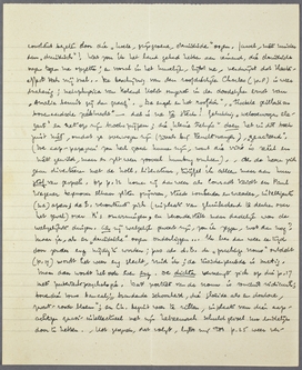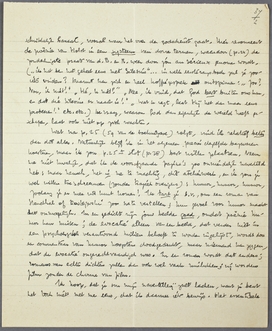 Wat na p.25 (59 van de boekuitgave) volgt, vind ik relatief beter dan dit alles. Natuurlijk blijf ik in het algemeen precies dezelfde bezwaren koesteren, maar ik zou p.25 + slot (p.38) best willen plaatsen. Neem me niet kwalijk, dat ik de voorafgaande pagina's zoo onvriendelijk naverteld heb: maar mensch, het is me te machtig, dit atelierwerk, en ik zou je wel willen toeschreeuwen (zonder tragiek overigens): humor, humor, humor, zoolang je er mee uit kunt komen! Ik tart je b.v., om een roman van Stendhal of Dostojevski zoo na te vertellen; hun gevoel voor humor maakt dat onmogelijk. In een gedicht zijn jouw beelden goed, omdat poëzie humor kan missen; de evocatie alleen van een beeld, dat verder niet in een psychologisch verantwoord milieu behoeft te worden ingelijst, wordt door een commentaar van humor hoogstens doodgedrukt, maar niemand kan zeggen, dat de evocatie ongerechtvaardigd was. In een roman wordt dat anders; romans van echte dichters zullen dan ook wel vaak mislukken; zij worden film zonder de charme van film.