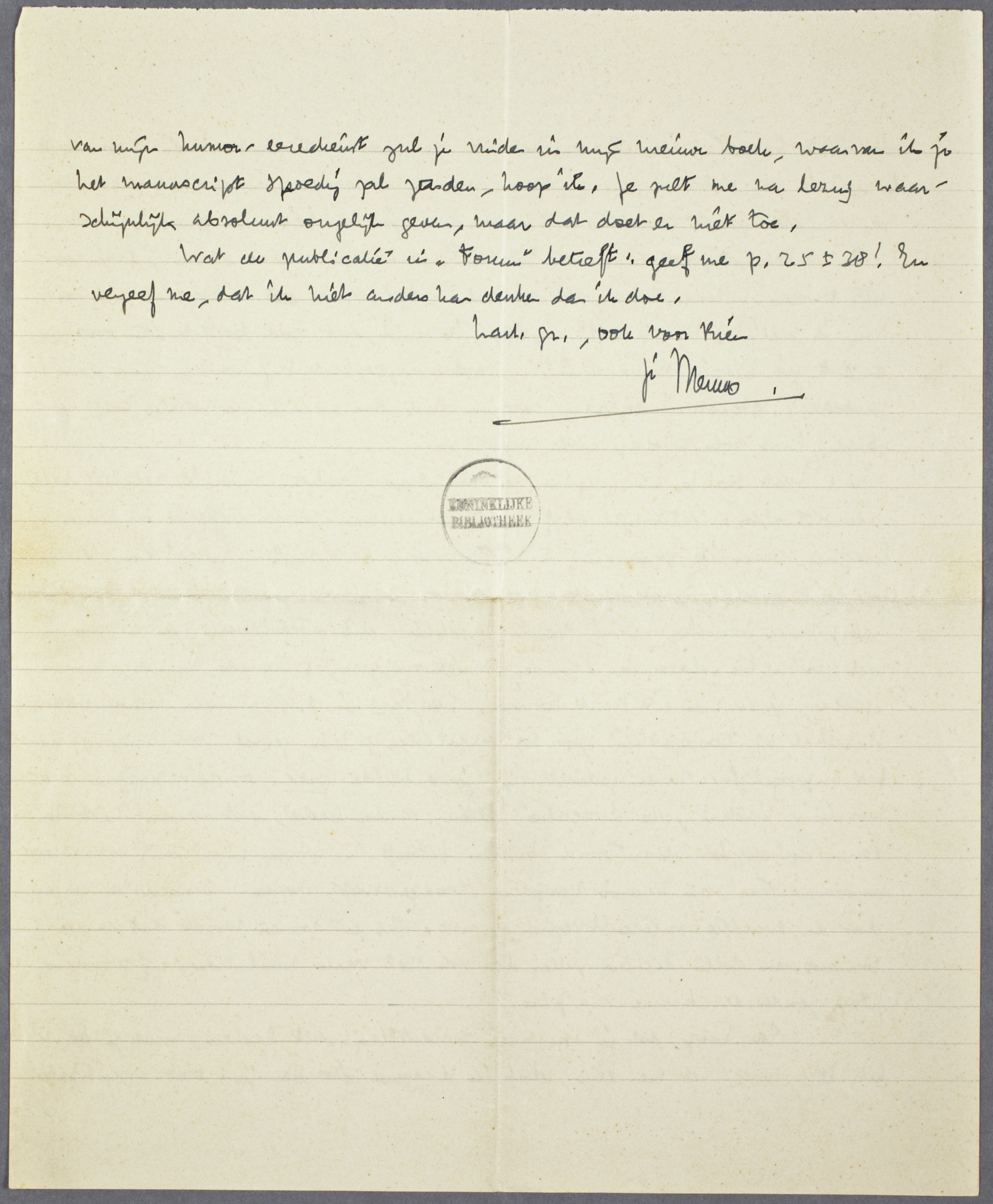 Vindt deze brief je nog in Utrecht? Ik hoorde, dat je naar Bergen ging. Enfin, anders krijg ik later wel antwoord. Erg jammer, dat de afspraak met Hemelvaart niet kon doorgaan. Ant is gelukkig weer geheel hersteld en weer de oude. - Ik zond je mijn stuk over ‘Coster’, dat gisteren in de N.R.Ct. heeft gestaan. Ben je het er mee eens?