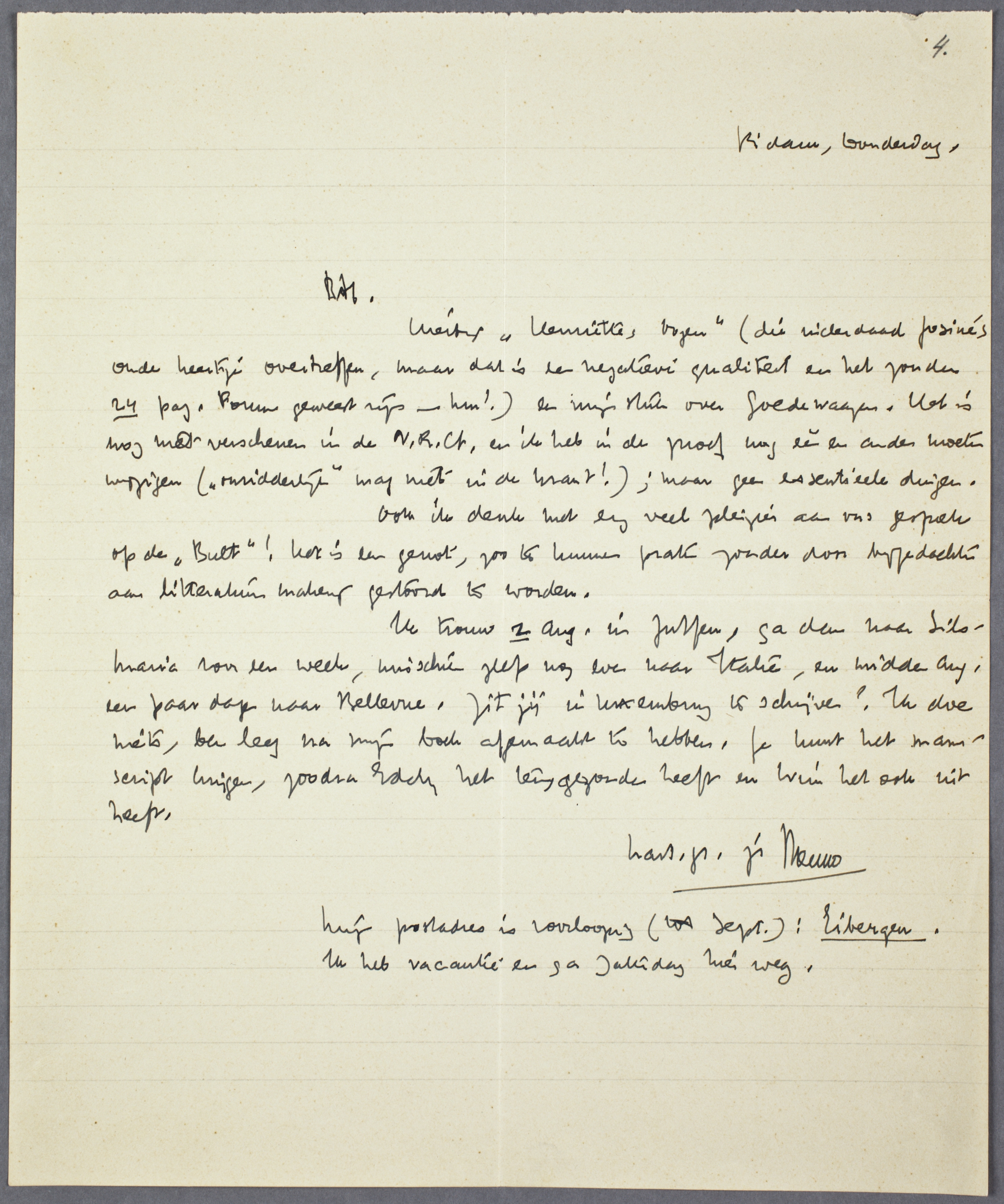 Ook ik denk met erg veel pleizier aan ons gesprek op de ‘Bult’! Het is een genot, zoo te kunnen praten zonder door bijgedachten aan litteratuur makerij gestoord te worden.