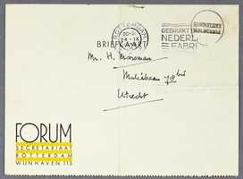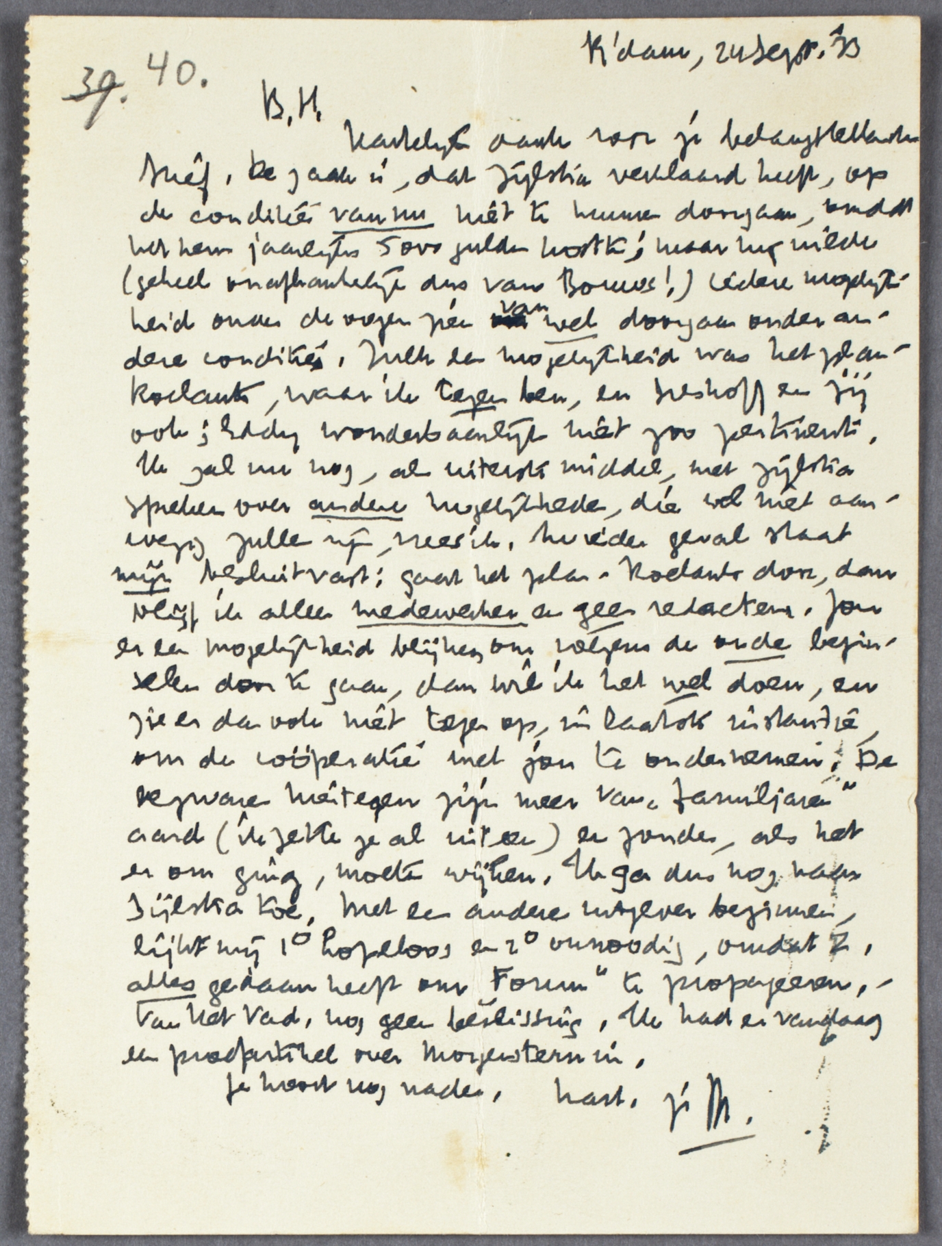 Hartelijk dank voor je belangstellenden brief. De zaak is, dat Zijlstra verklaard heeft, op de condities van nu niet te kunnen doorgaan, omdat het hem jaarlijks 5000 gulden kostte; maar hij wilde (geheel onafhankelijk dus van Bouws!) iedere mogelijkheid onder de oogen zien van wel doorgaan onder andere condities. Zulk een mogelijkheid was het plan-Roelants, waar ik tegen ben, en Greshoff en jij ook; Eddy wonderbaarlijk niet zoo pertinent. Ik zal nu nog, als uiterste middel, met Zijlstra spreken over andere mogelijkheden, die wel niet aanwezig zullen zijn, vrees ik. In ieder geval staat mijn besluit vast: gaat het plan-Roelants door, dan blijf ik alleen medewerker en geen redacteur. Zou er een mogelijkheid blijken om volgens de oude beginselen door te gaan, dan wil ik het wel doen, en zie er dan ook niet tegen op, in laatste instantie, om de coöperatie met jou te ondernemen; de bezwaren hiertegen zijn meer van ‘familiaren’ aard (ik zette ze al uiteen) en zouden, als het er om ging, moeten wijken. Ik ga dus nog naar Zijlstra toe. Met een andere uitgever beginnen, lijkt mij 1o hopeloos en 2o onnoodig, omdat Z. alles gedaan heeft om ‘Forum’ te propageeren. - Van Het Vad. nog geen beslissing. Ik had er vandaag een proefartikel over Morgenstern in.