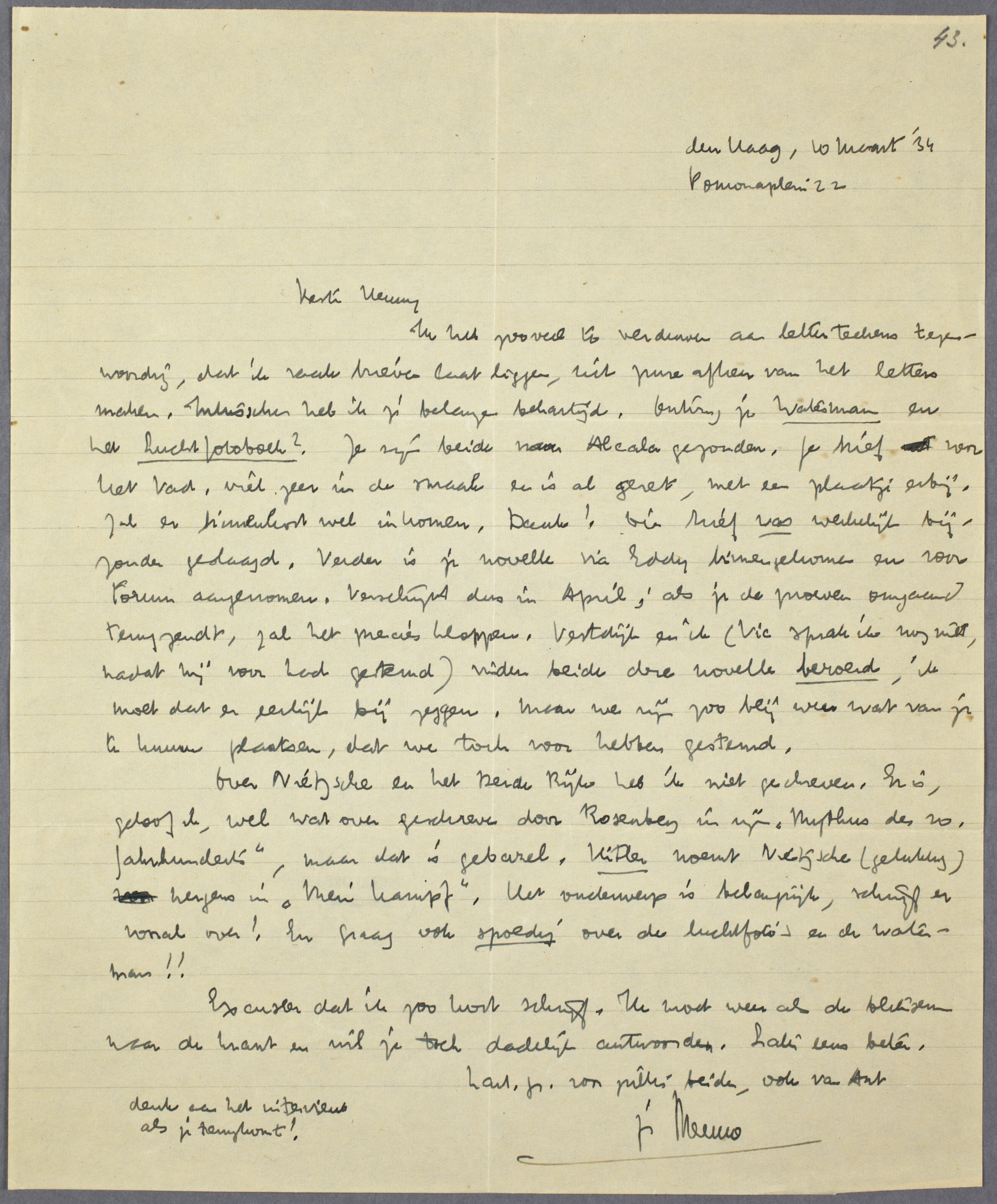 Ik heb zooveel te verduwen aan letterteekens tegenwoordig, dat ik vaak brieven laat liggen, uit pure afkeer van het letters maken. Intusschen heb ik je belangen behartigd. Ontving je Waterman en het Luchtfotoboek? Ze zijn beide naar Alcala gezonden. Je brief voor Het Vad. viel zeer in de smaak en is al gezet, met een plaatje erbij. Zal er binnenkort wel in komen. Dank! Die brief was werkelijk bijzonder geslaagd. Verder is je novelle via Eddy binnengekomen en voor Forum aangenomen. Verschijnt dus in April; als je de proeven omgaand terugzendt, zal het precies kloppen. Vestdijk en ik (Vic sprak ik nog niet, nadat hij voor had gestemd) vinden beide deze novelle beroerd, ik moet dat er eerlijk bij zeggen. Maar we zijn zoo blij weer wat van je te kunnen plaatsen, dat we toch voor hebben gestemd.