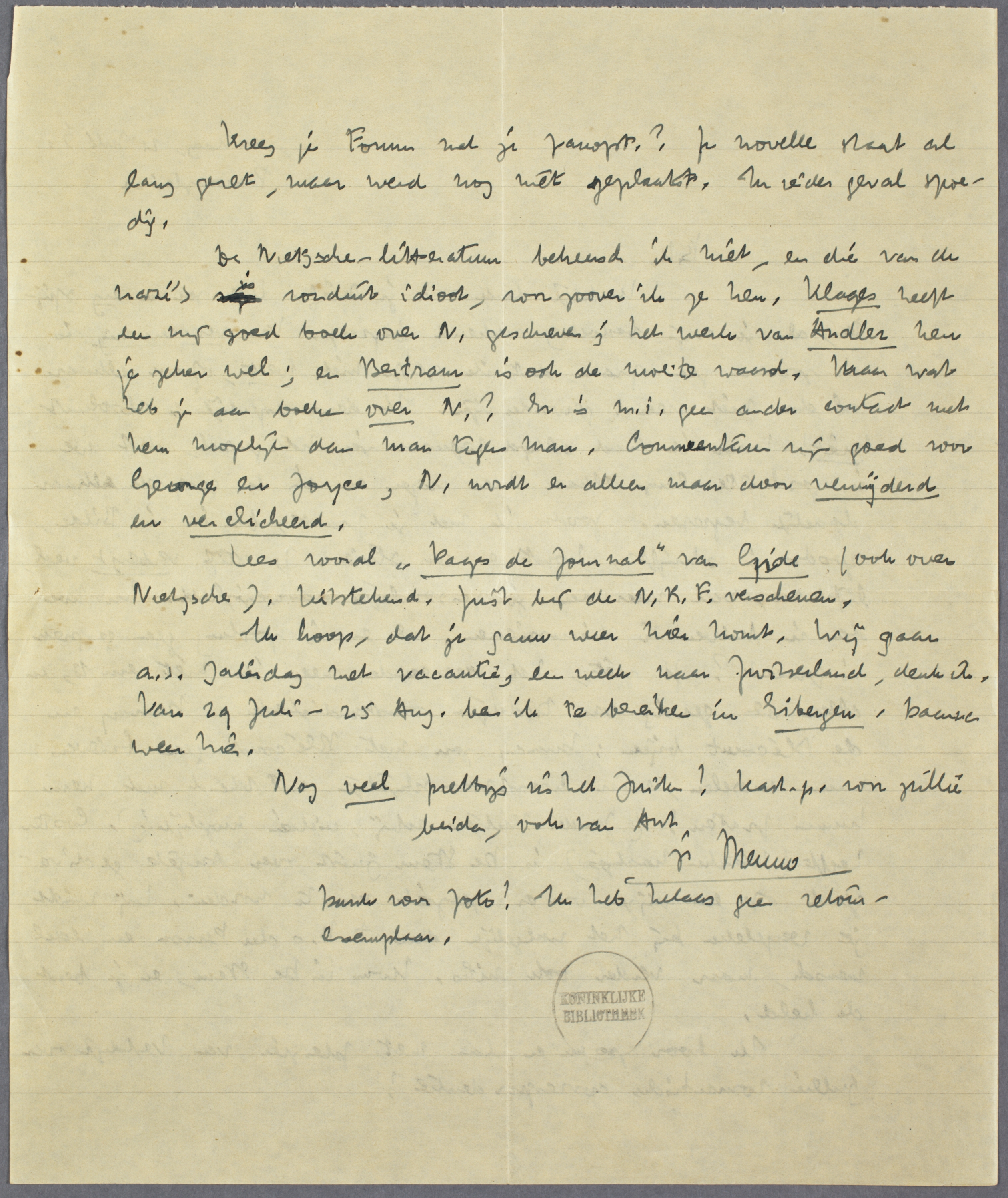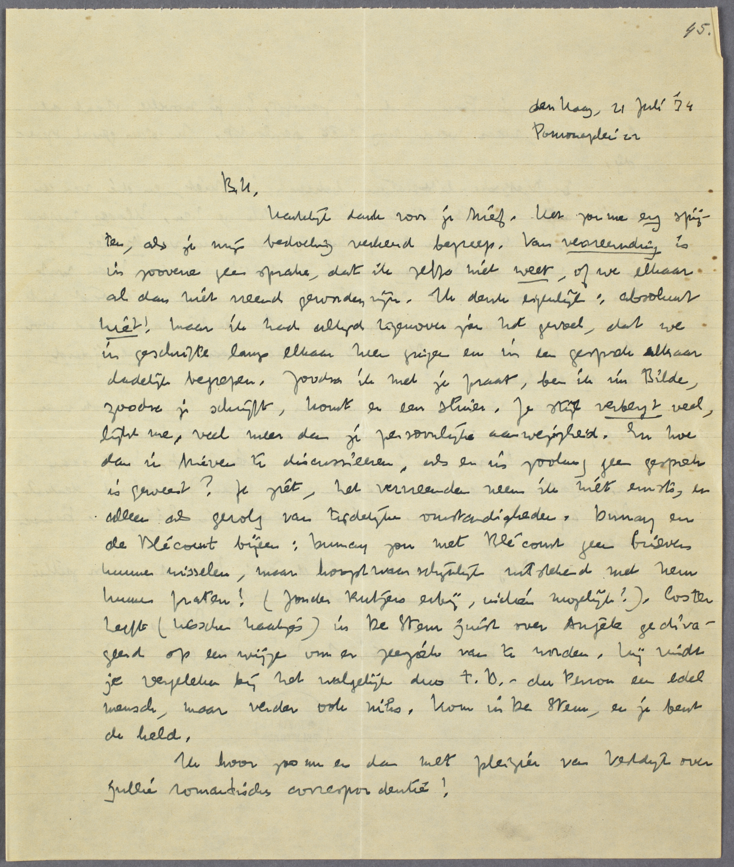 Hartelijk dank voor je brief. Het zou me erg spijten, als je mijn bedoeling verkeerd begreep. Van vervreemding is in zooverre geen sprake, dat ik zelfs niet weet, of we elkaar al dan niet vreemd geworden zijn. Ik denk eigenlijk: absoluut niet! Maar ik had altijd tegenover jou het gevoel, dat we in geschrifte langs elkaar heen gingen en in een gesprek elkaar dadelijk begrepen. Zoodra ik met je praat, ben ik im Bilde, zoodra je schrijft, komt er een sluier. Je stijl verbergt veel, lijkt me, veel meer dan je persoonlijke aanwezigheid. En hoe dan in brieven te discussieeren, als er in zoolang geen gesprek is geweest? Je ziet, het vervreemden neem ik niet ernstig en alleen als gevolg van tijdelijke omstandigheden. Dumay en de Blécourt bijeen: Dumay zou met Blécourt geen brieven kunnen wisselen, maar hoogstwaarschijnlijk uitstekend met hem kunnen praten! (Zonder Rutgers erbij, indien mogelijk!). Coster heeft (tusschen haakjes) in De Stem juist over Angèle gedivageerd op een wijze om er zeeziek van te worden. Hij vindt je vergeleken bij het walgelijk duo T.B.-du Perron een edel mensch, maar verder ook niks. Kom in De Stem, en je bent de held.
