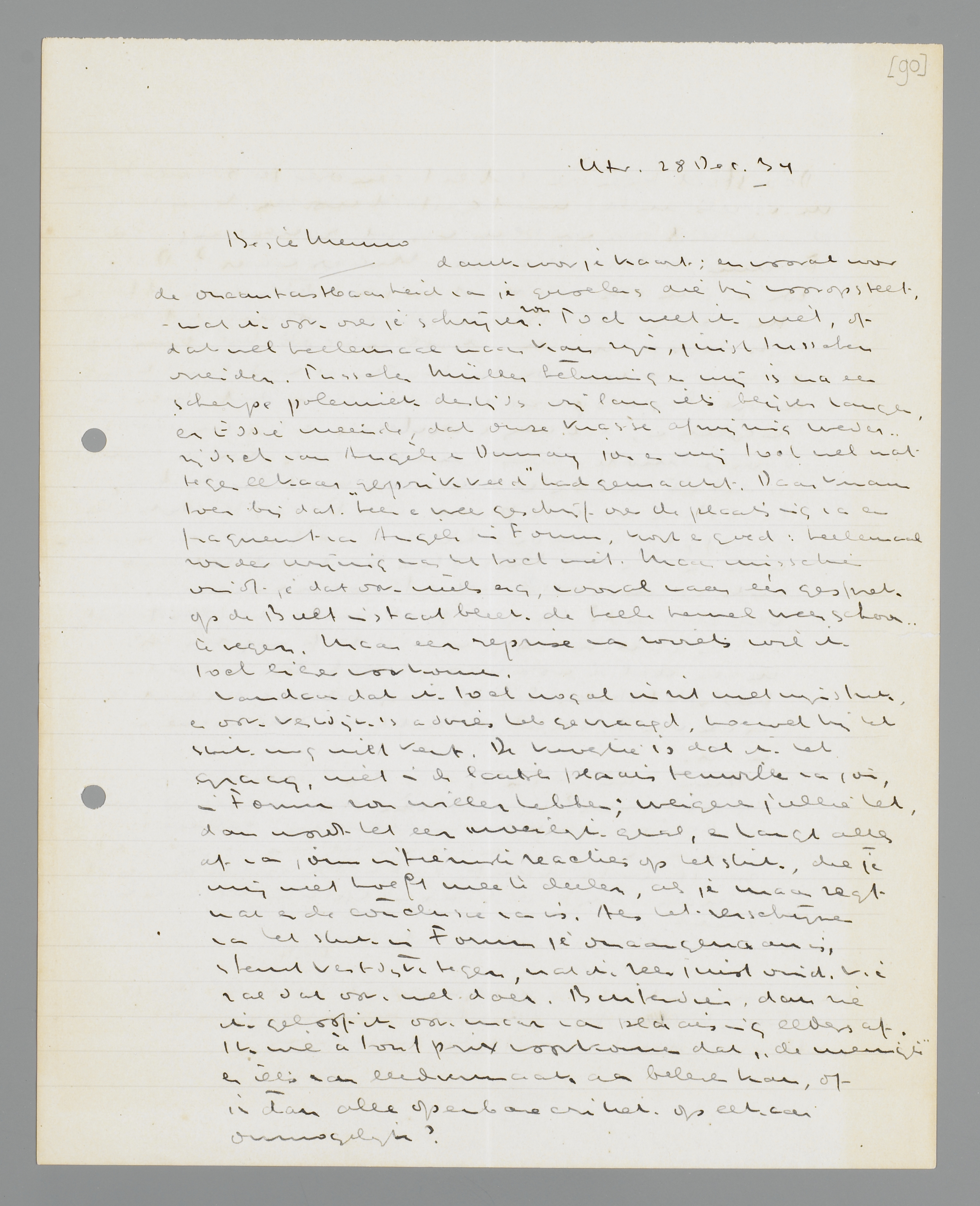 Daar staat tegen over dat er tegenover je poezie-theorie m.i. iets anders moet gesteld worden. Vandaar dat ik eerst ook van plan was het bij weigering door Forum, elders te plaatsen. Maar waar? Dat zou ik dan ook allereerst van jou hebben laten afhangen. Misschien heeft Bloem geen volmaakt ongelijk door je een ‘smaakvol en - godbetert - kundig! poëzie criticus’ te vinden. Ik lees het Vaderland haast nooit. Las, als poezie critiek alleen dat stuk over Engelman, dat mij irriteerde, en een eindeloos doorgeduwde ‘consequentie’ leek, zonder eenige realiteit, zonder verband ook met den [dichter], laat staan met de poëzie. Over Eddie, Vestdijk (ten deele), en Salomon schreef je héél goed, over Engelman meer dan beroerd. Misschien heb ik uit dat eene stuk gecombineerd met je theorieëen van vroeger, te veel afgeleid? Ik geloof het niet: ik geloof dat het een atavisme van je is, als je zelf nog zou wijsmaken dat je voor verzen voelt. Maar goed - hier is het stuk. Schrijf mij spoedig eens wat je er van vindt, en wat je denkt over publicatie en wáár.