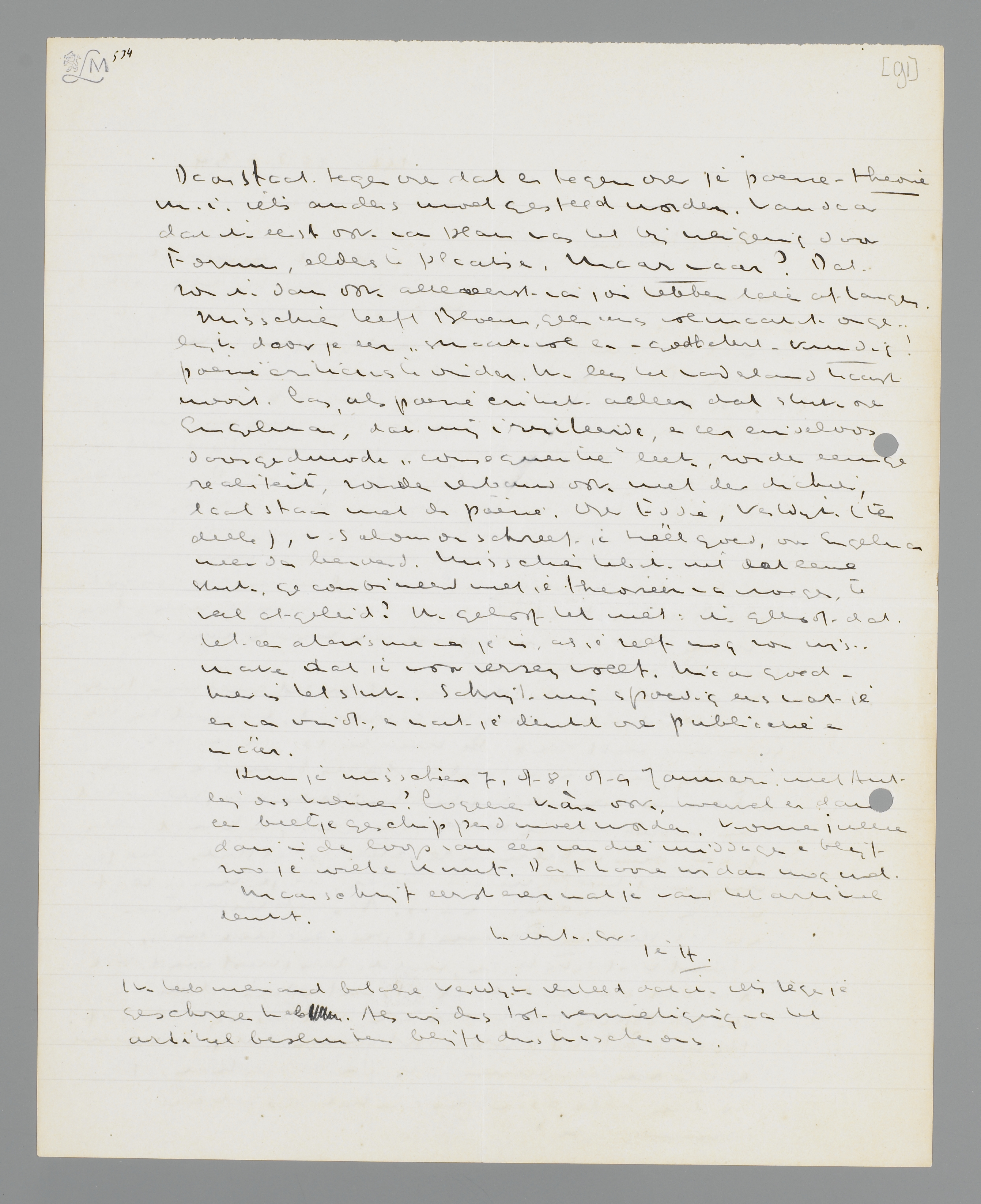 Dank voor je kaart; en vooral voor de onaantastbaarheid van je gevoelens die hij vooropstelt, - wat ik ook over je schrijven zou. Toch weet ik niet, of dat wel heelemaal waar kan zijn, juist tusschen vrienden. Tusschen Müller Lehning en mij is na een scherpe polemiek destijds vrij lang iets blijven hangen, en Eddie meende, dat onze krasse afwijzing wederzijdsch van Angèle en Dumay jou en mij toch wel wat tegen elkaar ‘geprikkeld’ had gemaakt. Daar kwam toen bij dat heen en weer geschrijf over de plaatsing van een fragment van Angèle in Forum, kort en goed: heelemaal zonder wrijving was het toch niet. Maar misschien vind je dat ook niets erg, vooral waar één gesprek op de Bult in staat bleek de heele hemel weer schoon te vegen. Maar een reprise van zooiets wil ik toch liever voorkomen.