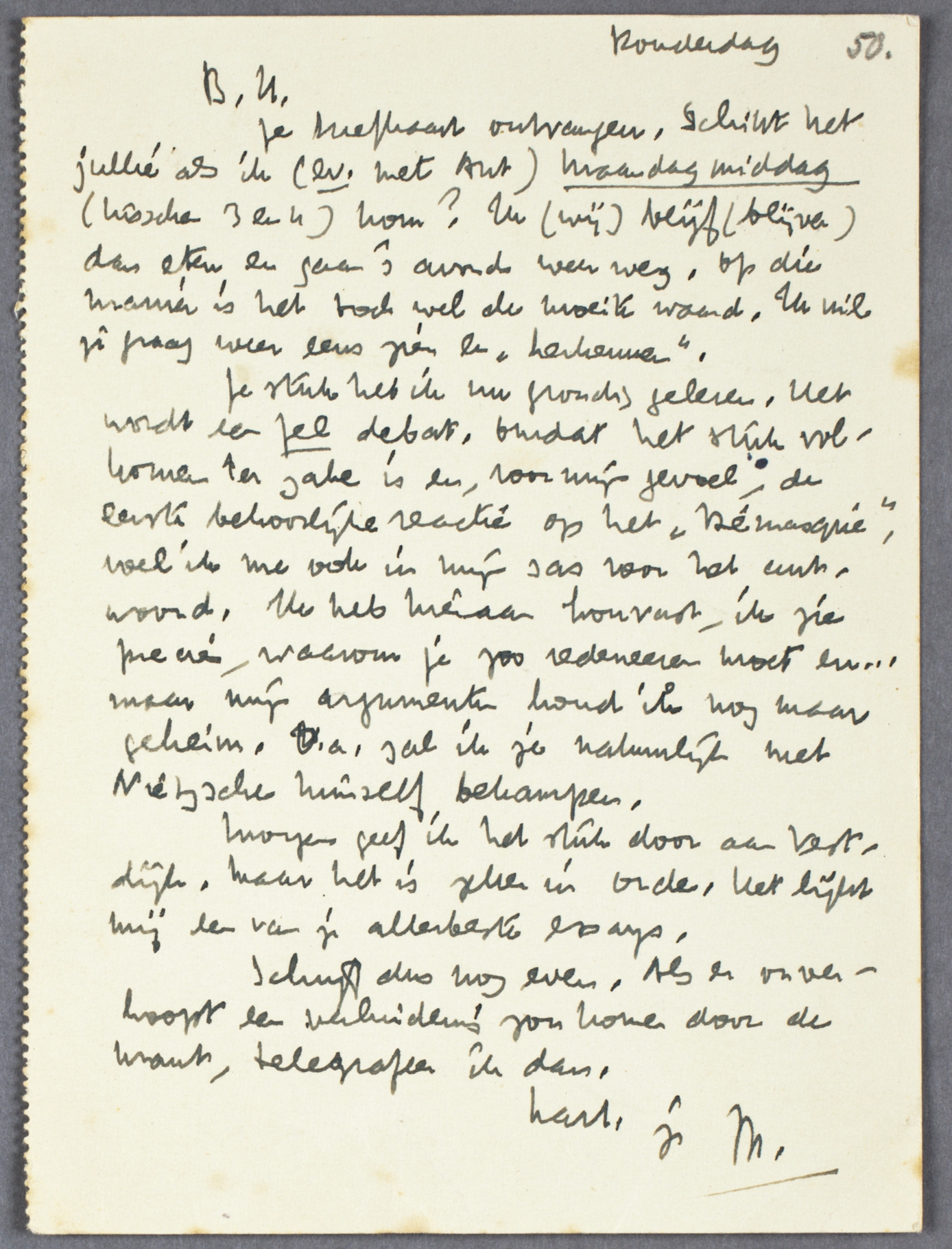 Je stuk heb ik nu grondig gelezen. Het wordt een fel debat, omdat het stuk volkomen ter zake is en, voor mijn gevoel, de eerste behoorlijke reactie op het ‘Démasqué’, voel ik me ook in mijn sas voor het antwoord. Ik heb hieraan houvast, ik zie precies, waarom je zoo redeneeren moet en... maar mijn argumenten houd ik nog maar geheim. O.a. zal ik je natuurlijk met Nietzsche himself bekampen.