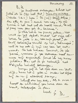Je briefkaart ontvangen. Schikt het jullie als ik (ev. met Ant) Maandagmiddag (tusschen 3 en 4) kom? Ik (wij) blijf (blijven) dan eten en gaan 's avonds weer weg. Op die manier is het toch wel de moeite waard. Ik wil je graag weer eens zien en ‘herkennen’.