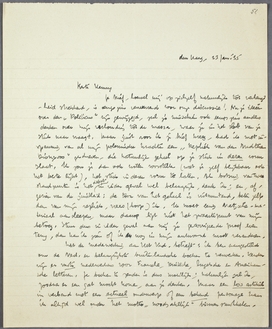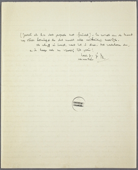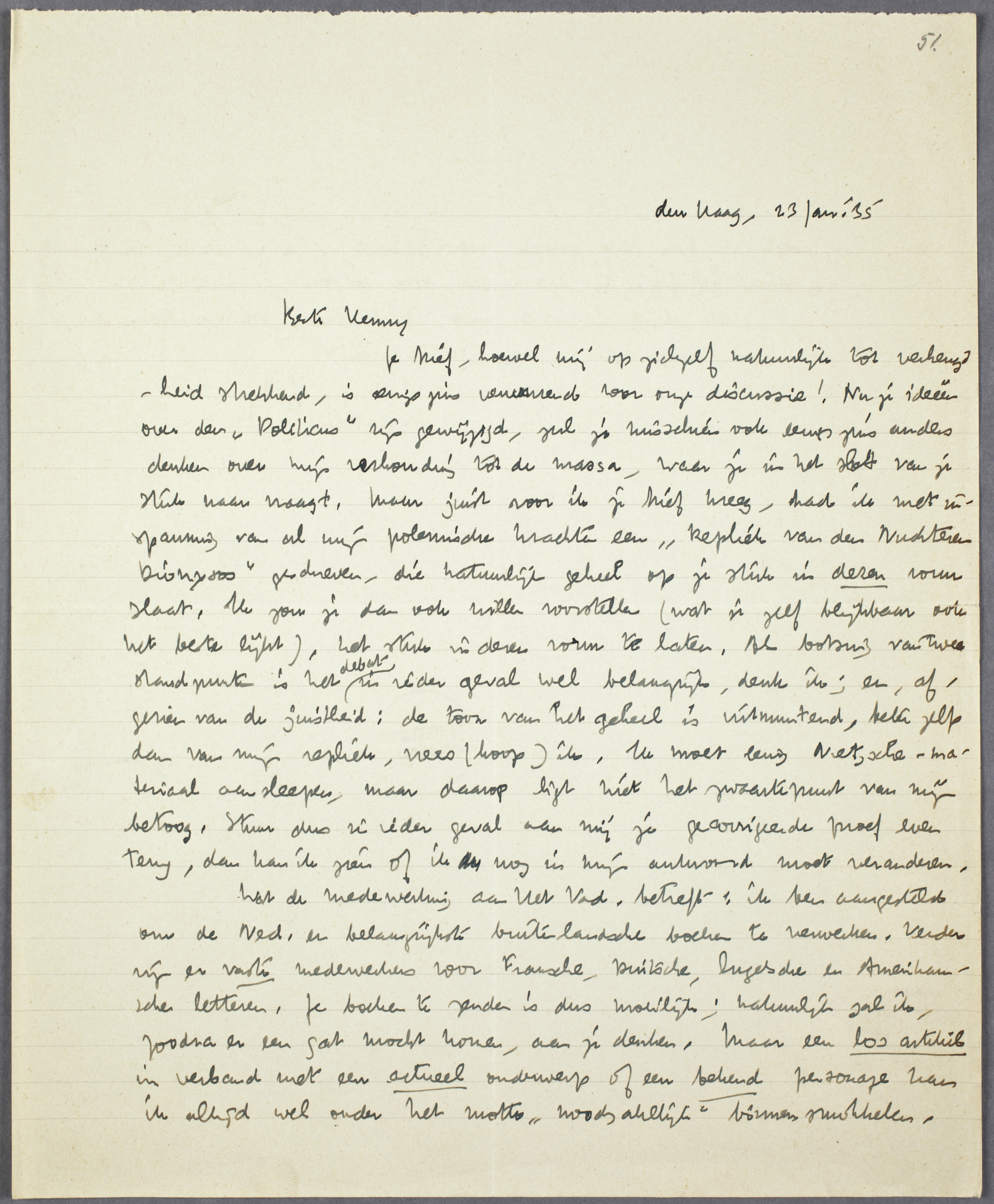 Je brief, hoewel mij op zichzelf natuurlijk tot verheugdheid strekkend, is eenigszins verwarrend voor onze discussie! Nu je ideeën over den ‘Politicus’ zijn gewijzigd, zul je misschien ook eenigszins anders denken over mijn verhouding tot de massa, waar je in het slot van je stuk naar vraagt. Maar juist voor ik je brief kreeg, had ik met inspanning van al mijn polemische krachten een ‘Repliek van den Nuchteren Dionysos’ geschreven, die natuurlijk geheel op je stuk in dezen vorm slaat. Ik zou je dan ook willen voorstellen (wat je zelf blijkbaar ook het beste lijkt), het stuk in dezen vorm te laten. Als botsing van twee standpunten is het debat in ieder geval wel belangrijk, denk ik; en, afgezien van de juistheid: de toon van het geheel is uitmuntend, beter zelfs dan van mijn repliek, vrees (hoop) ik. Ik moet eenig Nietzsche-materiaal aansleepen, maar daarop ligt niet het zwaartepunt van mijn betoog. Stuur dus in ieder geval aan mij je gecorrigeerde proef even terug, dan kan ik zien of ik nog in mijn antwoord moet veranderen.