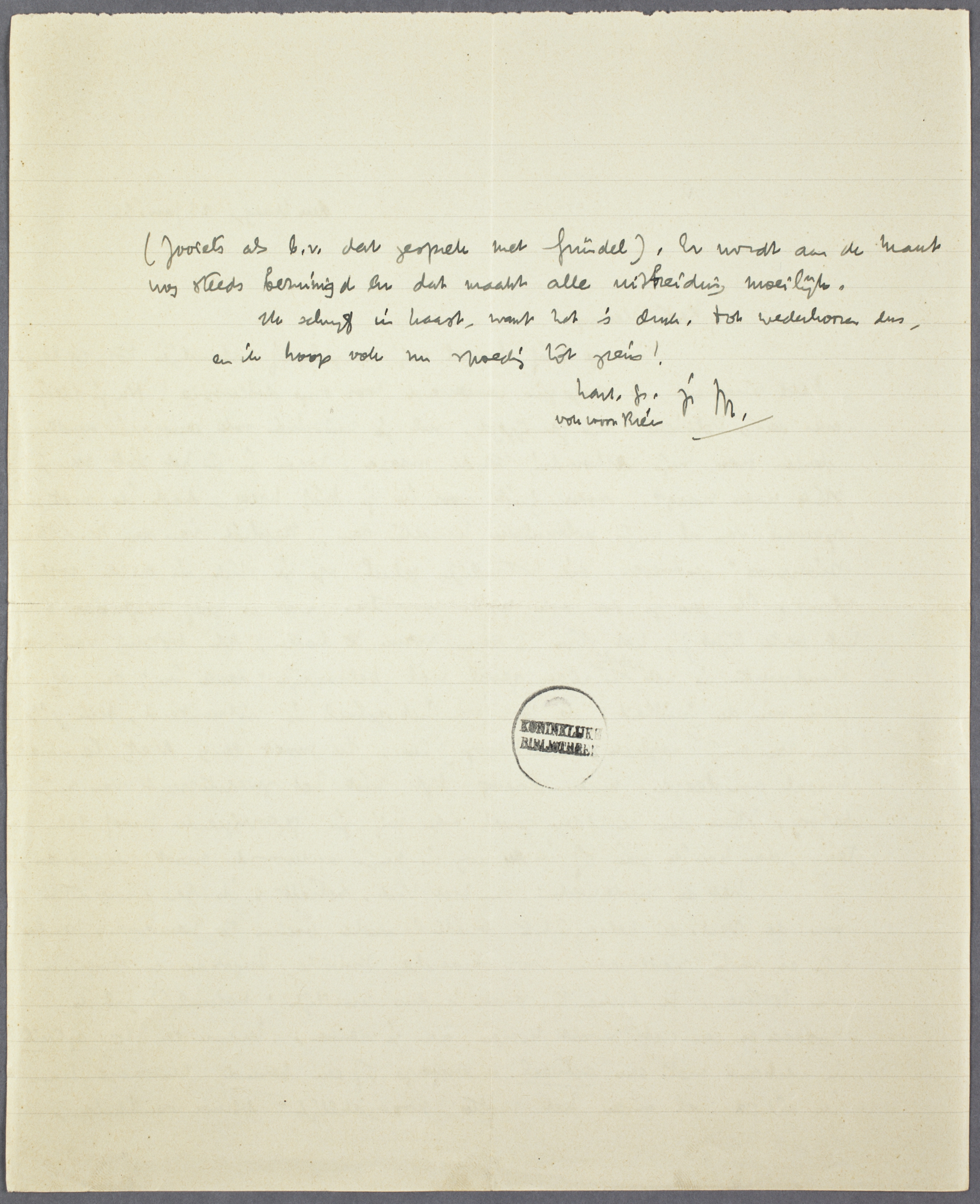 Wat de medewerking aan Het Vad. betreft: ik ben aangesteld om de Ned. en belangrijkste buitenlandsche boeken te verwerken. Verder zijn er vaste medewerkers voor Fransche, Duitsche, Engelsche en Amerikaansche letteren. Je boeken te zenden is dus moeilijk; natuurlijk zal ik, zoodra er een gat mocht komen, aan je denken. Maar een los artikel in verband met een actueel onderwerp of een bekend personage kan ik altijd wel onder het motto ‘noodzakelijk’ binnensmokkelen (zooiets als b.v. dat gesprek met Gründel). Er wordt aan de krant nog steeds bezuinigd en dat maakt alle uitbreiding moeilijk.