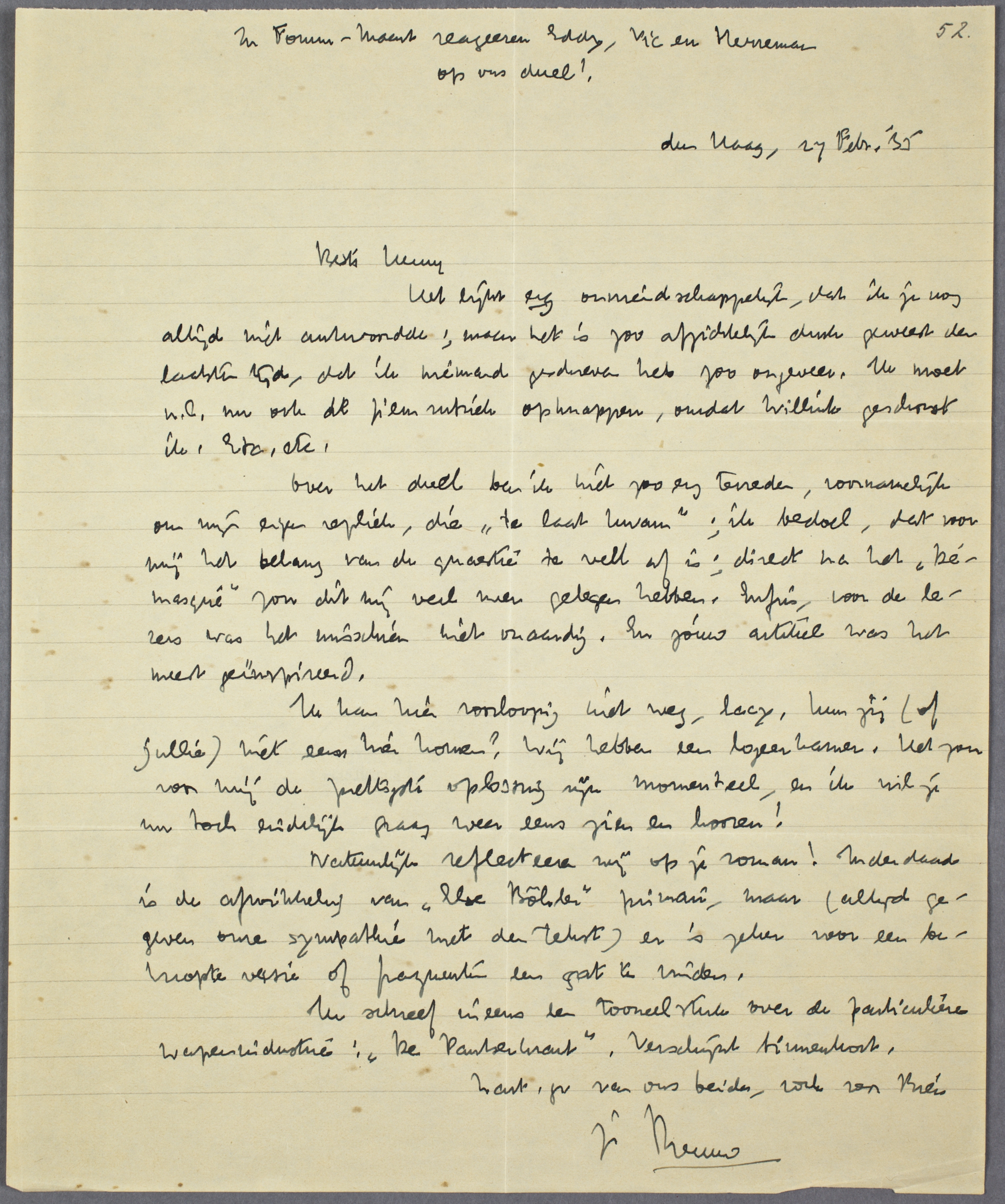 Het lijkt erg onvriendschappelijk, dat ik je nog altijd niet antwoordde; maar het is zoo afzichtelijk druk geweest den laatsten tijd, dat ik niemand geschreven heb zoo ongeveer. Ik moet n.l. nu ook de filmrubriek opknappen, omdat Willink geschorst is. Etc. etc.