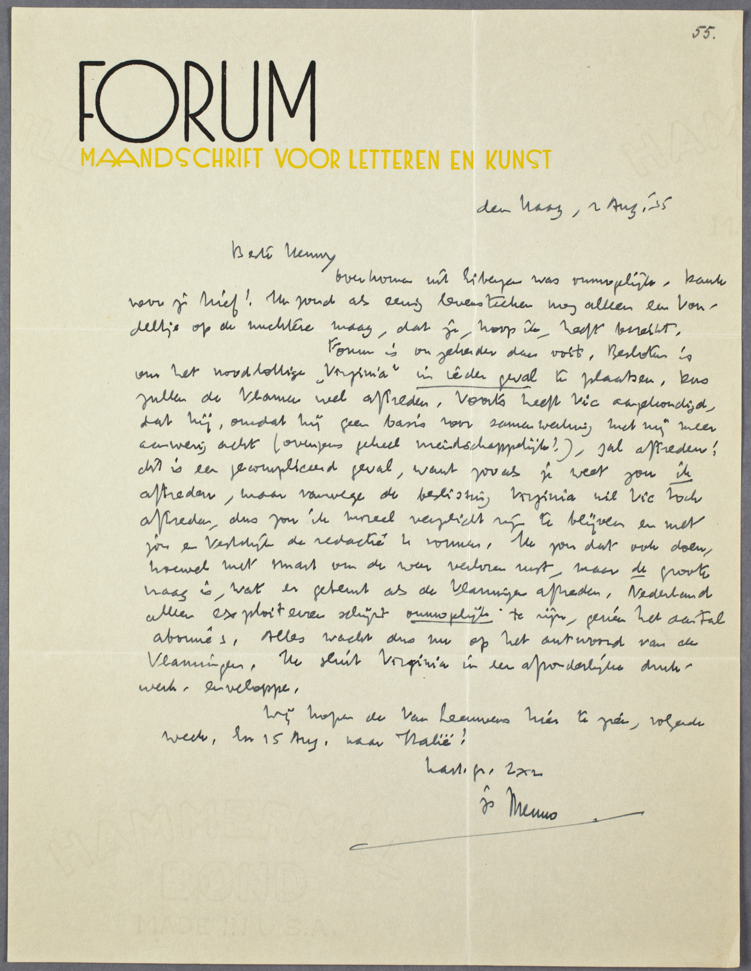 Forum is onzekerder dan ooit. Besloten is om het noodlottige ‘Virginia’ in ieder geval te plaatsen. Dus zullen de Vlamingen weer aftreden. Voorts heeft Vic aangekondigd, dat hij, omdat hij geen basis voor samenwerking met mij meer aanwezig acht (overigens geheel vriendschappelijk!), zal aftreden! Dit is een gecompliceerd geval, want zooals je weet zou ik aftreden, maar vanwege de beslissing Virginia wil Vic toch aftreden, dus zou ik moreel verplicht zijn te blijven en met jou en Vestdijk de redactie te vormen. Ik zou dat ook doen, hoewel met smart om de weer verloren rust, maar de groote vraag is, wat er gebeurt als de Vlamingen aftreden. Nederland alleen exploiteeren schijnt onmogelijk te zijn, gezien het aantal abonné's. Alles wacht nu dus op het antwoord van de Vlamingen. Ik sluit Virginia in een afzonderlijke drukwerk-enveloppe.