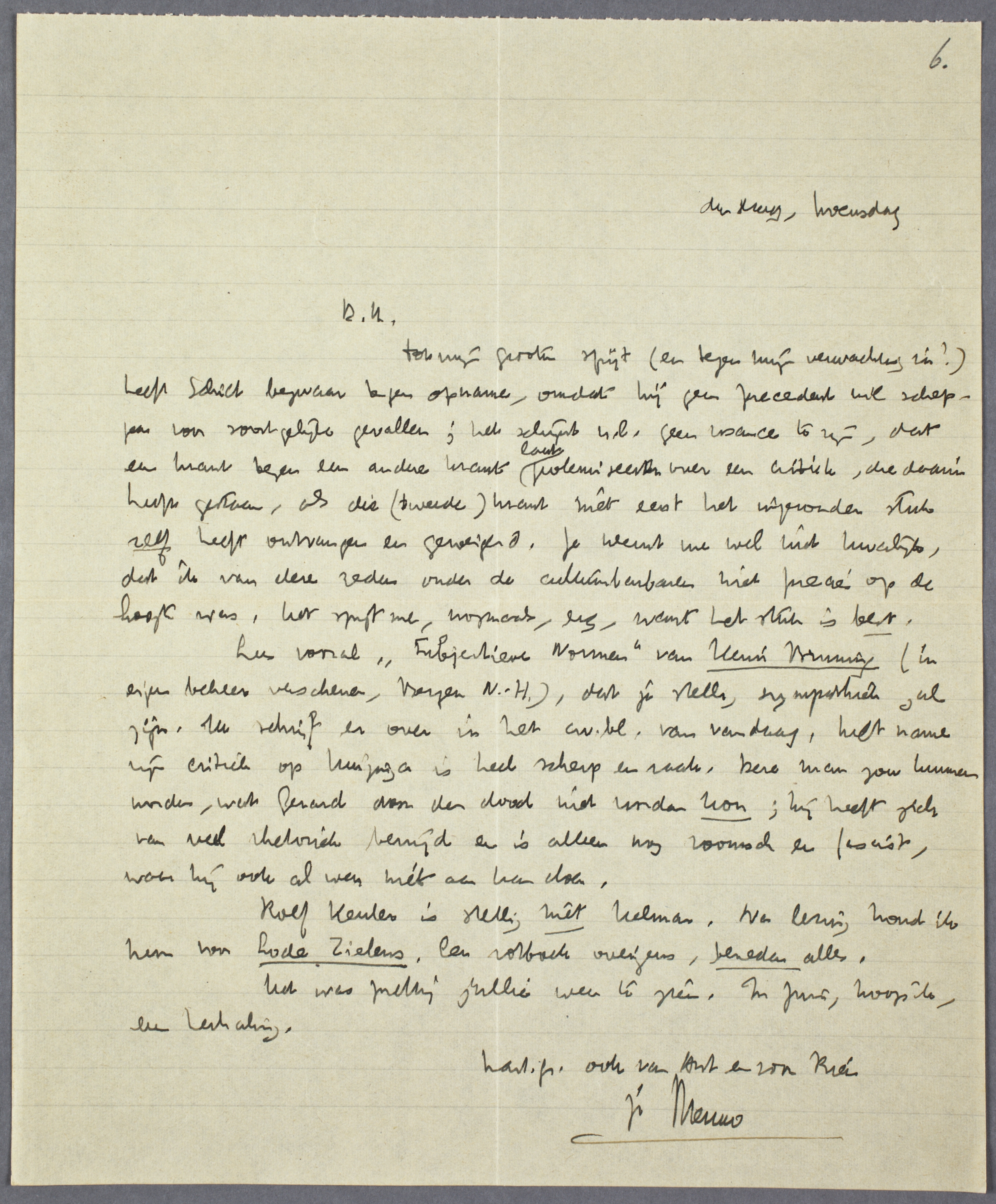 Lees vooral ‘Subjectieve Normen’ van Henri Bruning (in eigen beheer verschenen, Bergen N.-H.), dat je stellig erg sympathiek zal zijn. Ik schrijf er over in het av. bl. van vandaag, met name zijn critiek op Huizinga is heel scherp en raak. Deze man zou kunnen worden, wat Gerard door den dood niet worden kon; hij heeft zich van veel rhetoriek bevrijd en is alleen nog roomsch en fascist, waar hij ook al weer niets aan kan doen.