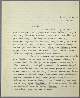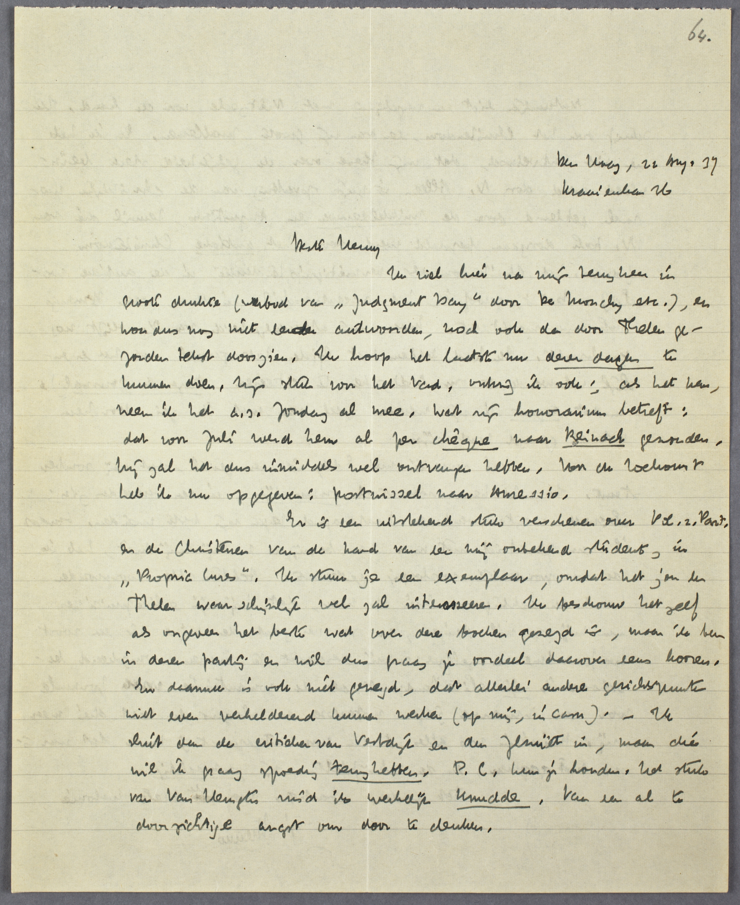 Ik viel hier na mijn terugkeer in groote drukte (verbod van ‘Judgement Day’ door De Monchy etc.), en kon dus nog niet eerder antwoorden, noch ook de door Thelen gezonden tekst doorzien. Ik hoop het laatste nu dezer dagen te kunnen doen. Zijn stuk voor Het Vad. ontving ik ook; als het kan, neem ik het a.s. Zondag al mee. Wat zijn honorarium betreft: dat voor Juli werd hem al per cheque naar Reinach gezonden. Hij zal het dus inmiddels wel ontvangen hebben. Voor de toekomst heb ik nu opgegeven: postwissel naar Auressio.