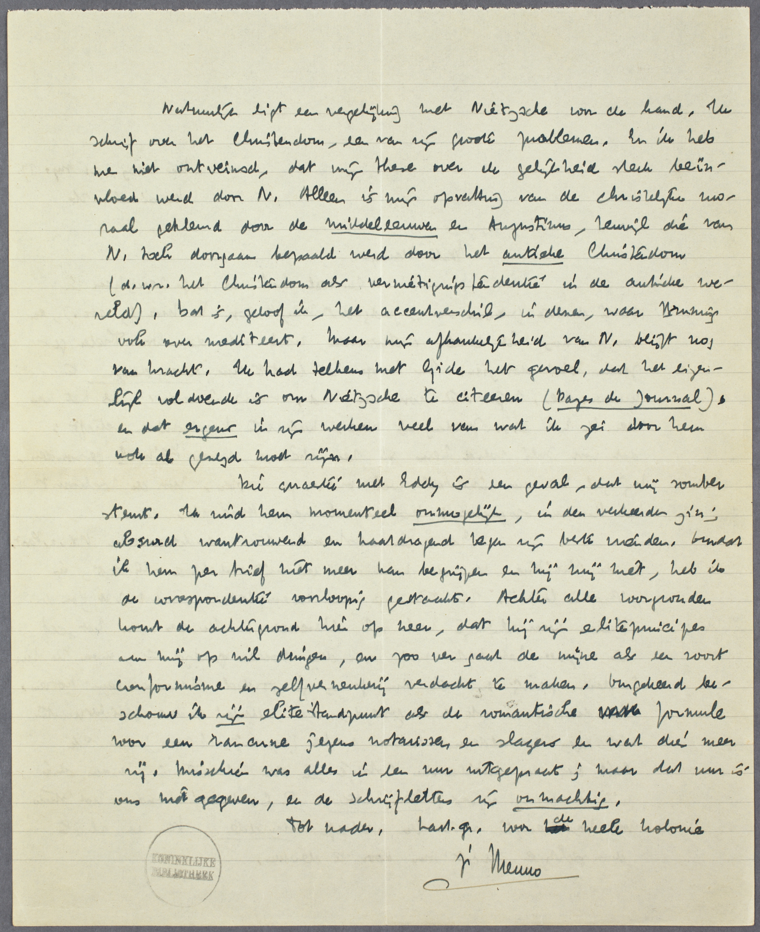 Natuurlijk ligt een vergelijking met Nietzsche voor de hand. Ik schrijf over het Christendom, een van zijn groote problemen. En ik heb me niet ontveinsd, dat mijn these over de gelijkheid sterk beïnvloed werd door N. Alleen is mijn opvatting van de christelijke moraal gekleurd door de middeleeuwen en Augustinus, terwijl die van N. toch doorgaans bepaald werd door het antieke Christendom (d.w.z. het Christendom als vernietigingstendentie in de antieke wereld). Dat is, geloof ik, het accentverschil, in dezen, waar Bruning ook over mediteert. Maar mijn afhankelijkheid van N. blijft nog van kracht. Ik had telkens met Gide het gevoel, dat het eigenlijk voldoende is om Nietzsche te citeeren (Pages de Journal), en dat ergens in zijn werken veel van wat ik zei door hem ook al gezegd moet zijn.