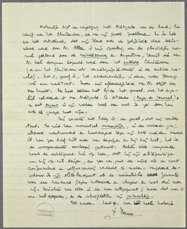 Er is een uitstekend stuk verschenen over Pol. z. Part. en de Christenen van de hand van een mij onbekend student, in ‘Propria Cures’. Ik stuur je een exemplaar, omdat het jou en Thelen waarschijnlijk wel zal interesseeren. Ik beschouw het zelf als ongeveer het beste wat over deze boeken gezegd is, maar ik ben in dezen partij en wil dus graag je oordeel daarover eens hooren. En daarmee is ook niet gezegd, dat allerlei andere gezichtspunten niet even verhelderend kunnen werken (op mij, in casu). - Ik sluit dan de critieken van Vestdijk en den Jezuïet in, maar die wil ik graag spoedig terughebben. P.C. kun je houden. Het stuk van Van Heugten vind ik werkelijk knudde. Van een al te doorzichtige angst om door te denken.
