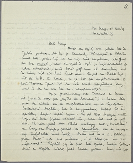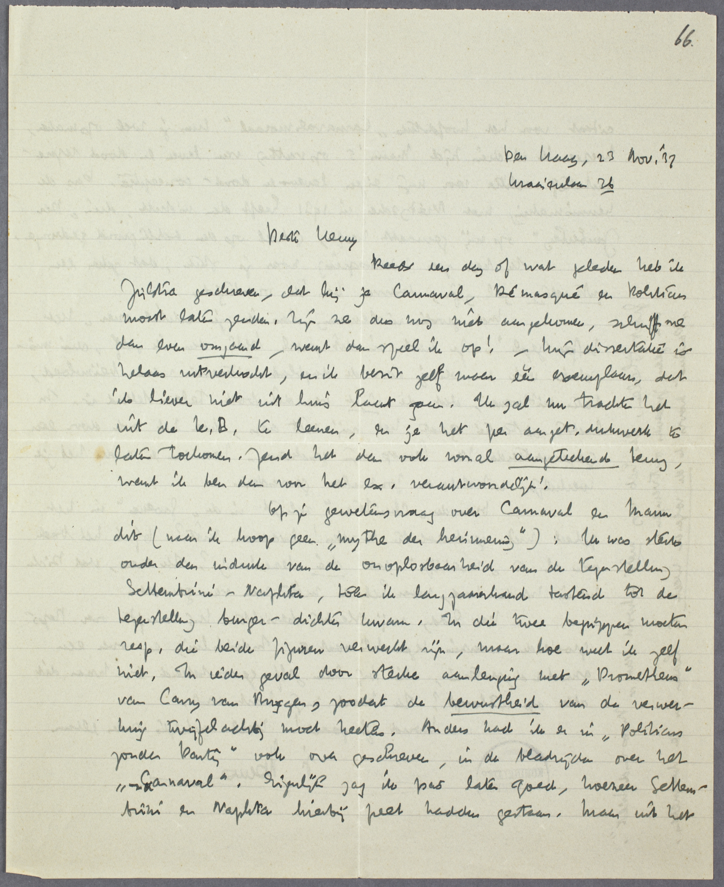 Reeds een dag of wat geleden heb ik Zijlstra geschreven, dat hij je Carnaval, Démasqué en Politicus moest laten zenden. Zijn ze dus nog niet aangekomen, schrijf me dan even omgaand, want dan speel ik op! - Mijn dissertatie is helaas uitverkocht, en ik bezit zelf maar één exemplaar, dat ik liever niet uit huis laat gaan. Ik zal nu trachten het uit de K.B. te leenen, en je het per aanget. drukwerk te laten toekomen. Zend het dan ook vooral aangeteekend terug, want ik ben dan voor het ex. verantwoordelijk!