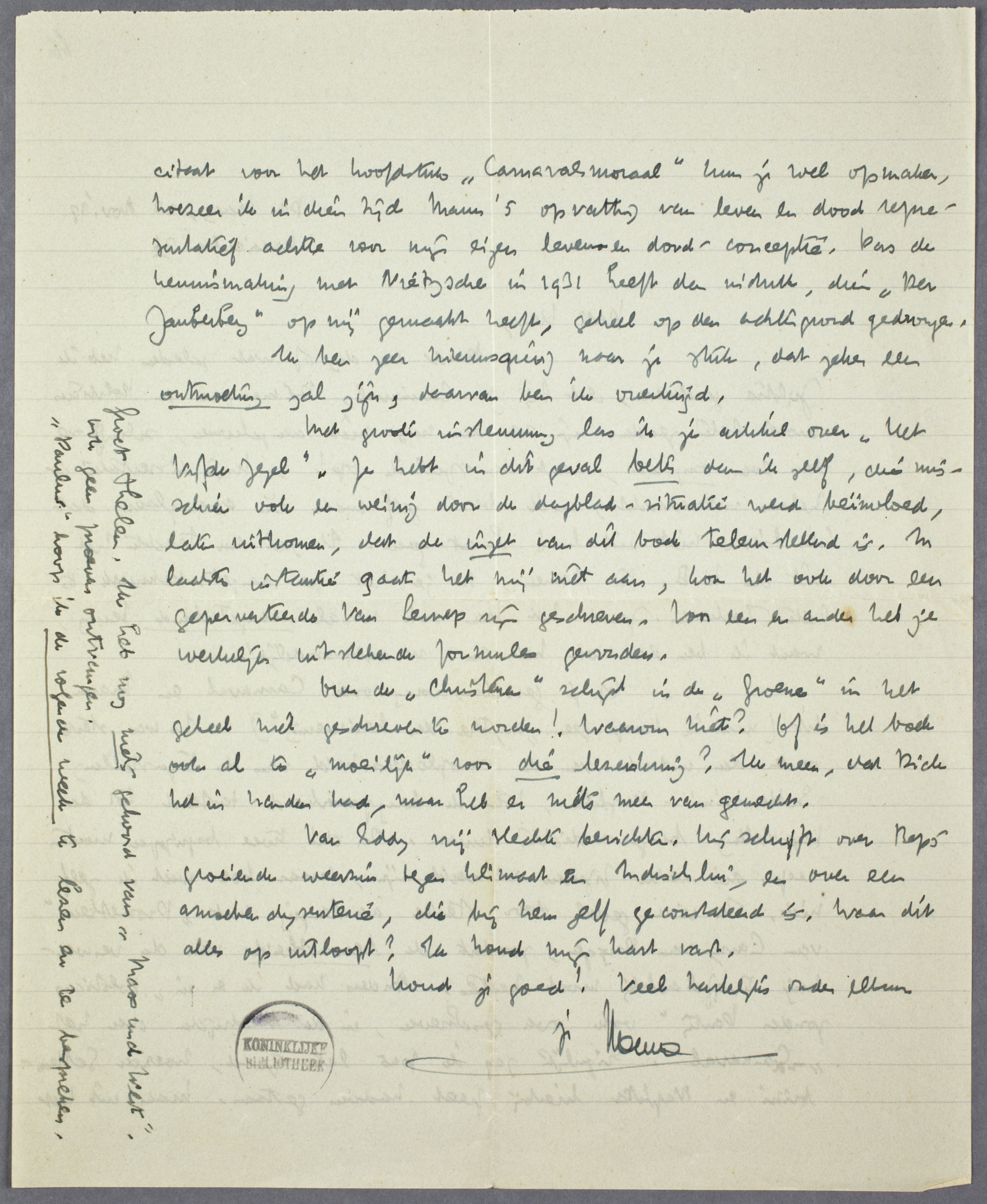 Op je gewetensvraag over Carnaval en Mann dit (naar ik hoop geen ‘mythe der herinnering’): Ik was sterk onder den indruk van de onoplosbaarheid van de tegenstelling Settembrini - Naphta, toen ik langzamerhand tastend tot de tegenstelling burger - dichter kwam. In die twee begrippen moeten resp. die beide figuren verwerkt zijn, maar hoe weet ik zelf niet. In ieder geval door sterke aanlenging met ‘Prometheus’ van Carry van Bruggen, zoodat de bewustheid van de verwerking twijfelachtig moet heeten. Anders had ik er in ‘Politicus zonder Partij’ ook over geschreven, in de bladzijden over het ‘Carnaval’. Eigenlijk zag ik pas later goed, hoezeer Settembrini en Naphta hierbij peet hadden gestaan. Maar uit het citaat voor het hoofdstuk ‘Carnavalsmoraal’ kun je wel opmaken, hoezeer ik in dien tijd Mann's opvatting van leven en dood representatief achtte voor mijn eigen leven- en dood - conceptie. Pas de kennismaking met Nietzsche in 1931 heeft den indruk, dien ‘Der Zauberberg’ op mij gemaakt heeft, geheel op den achtergrond gedrongen.