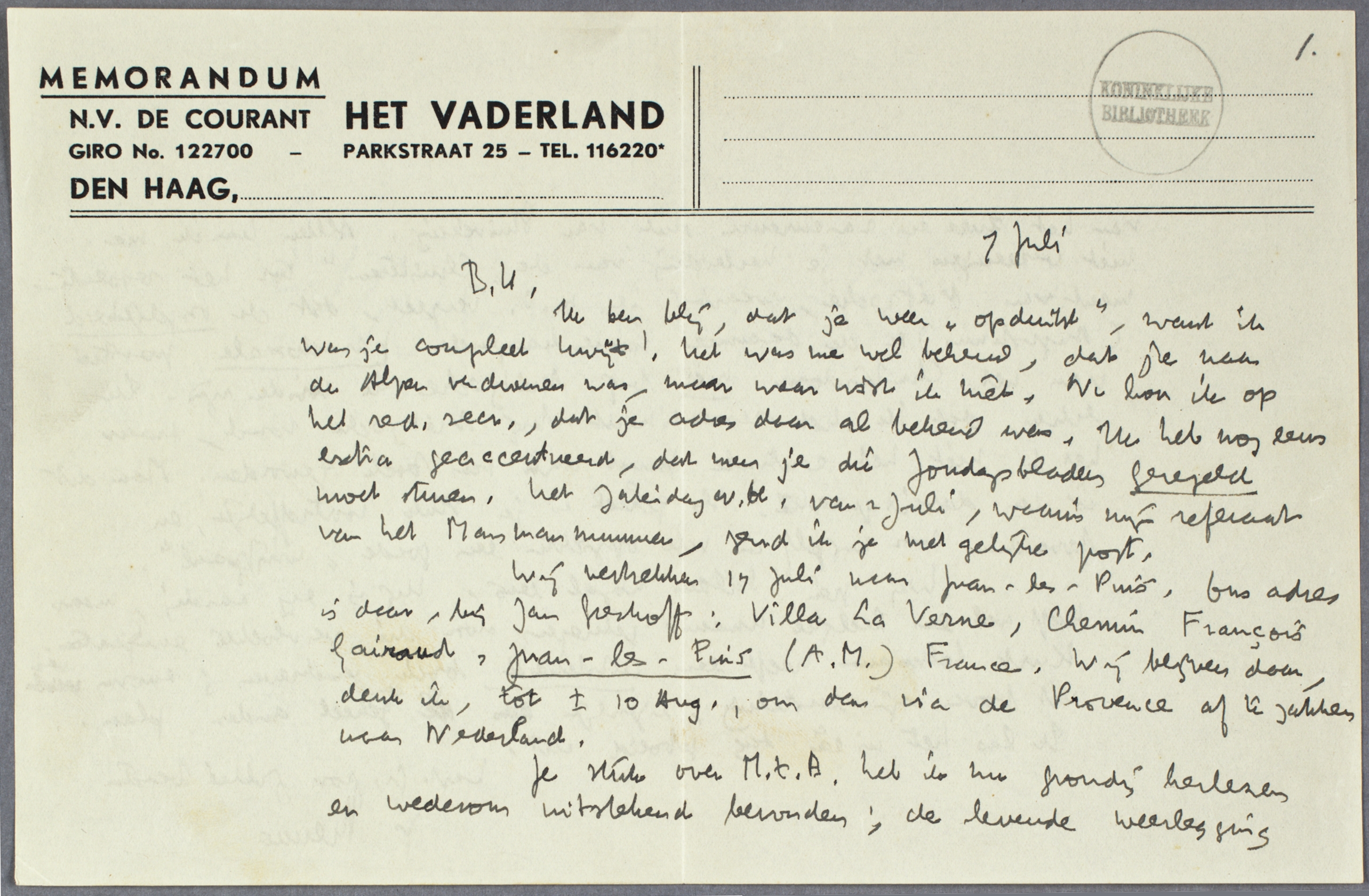 Wij vertrekken 17 juli naar Juan-les-Pins. Ons adres is daar, bij Jan Greshoff: Villa La Verne, Chemin François Gairaud, Juan-les-Pins (A.M.) France. Wij blijven daar, denk ik, tot ± 10 Aug., om dan via de Provence af te zakken naar Nederland.