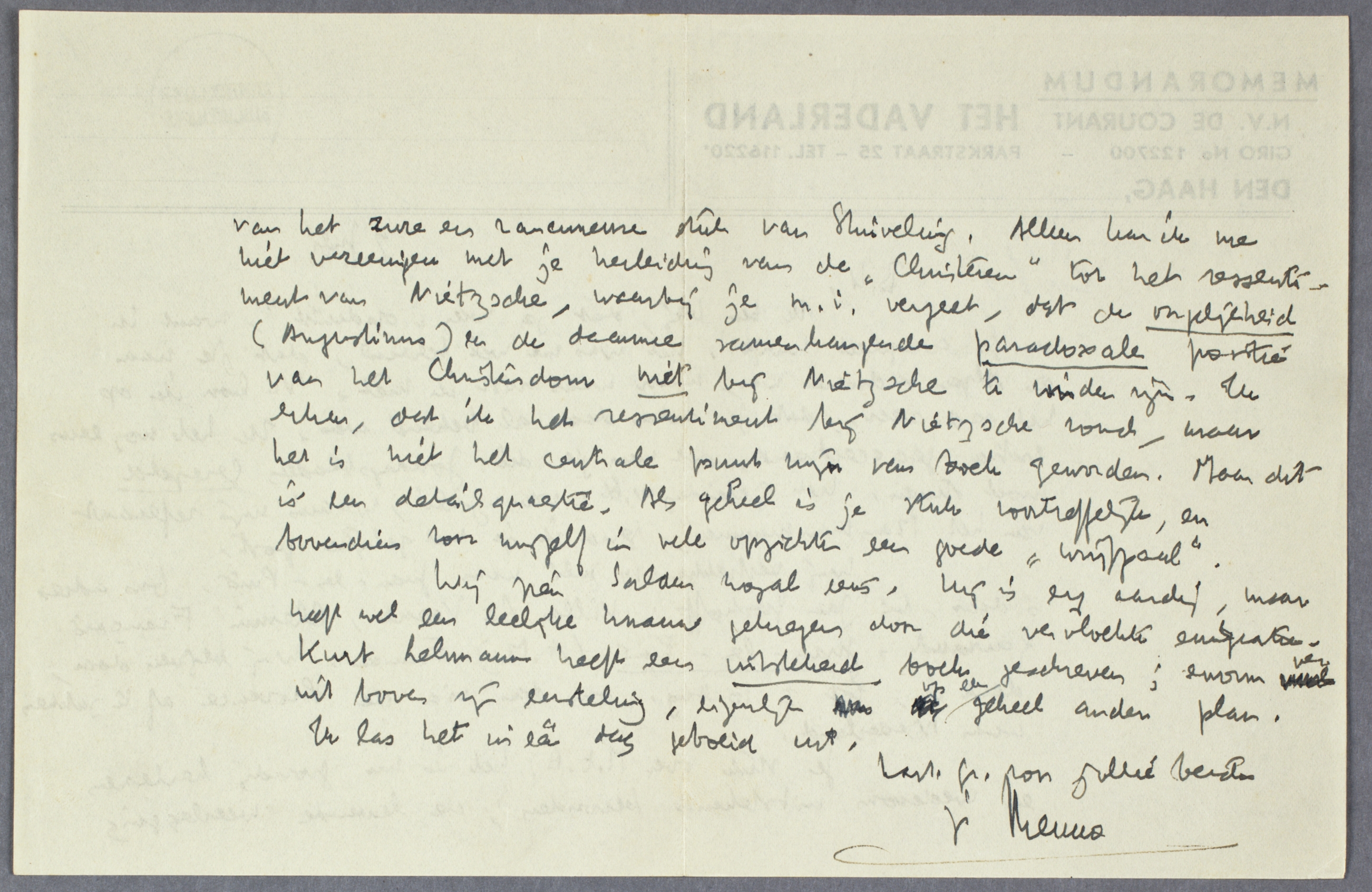 Je stuk over M.t.B. heb ik nu grondig herlezen en wederom uitstekend bevonden; de levende weerlegging van het zure en rancuneuze stuk van Stuiveling. Alleen kan ik me niet vereenigen met je herleiding van de ‘Christenen’ tot het ressentiment van Nietzsche, waarbij je m.i. vergeet, dat de ongelijkheid (Augustinus) en de daarmee samenhangende paradoxale positie van het Christendom niet bij Nietzsche te vinden zijn. Ik erken, dat ik het ressentiment bij Nietzsche vond, maar het is niet het centrale punt van mijn boek geworden. Maar dit is een detailquaestie. Als geheel is je stuk voortreffelijk, en bovendien voor mijzelf in vele opzichten een goede ‘wrijfpaal’.