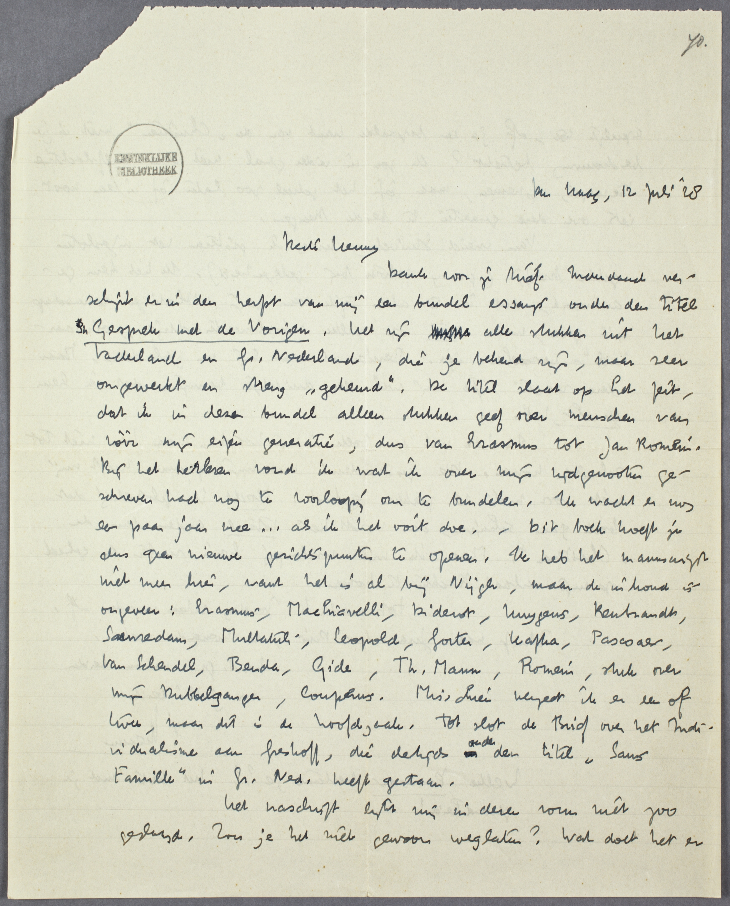 Dank voor je brief. Inderdaad verschijnt er in den herfst van mij een bundel essays onder den titel Gesprek met de Vorigen. Het zijn alle stukken uit Het Vaderland en Gr. Nederland, die je bekend zijn, maar zeer omgewerkt en streng ‘gekeurd’. De titel slaat op het feit, dat ik in deze bundel alleen stukken geef over menschen van vòòr mijn eigen generatie, dus van Erasmus tot Jan Romein. Bij het herlezen vond ik wat ik over mijn tijdgenooten geschreven had nog te voorloopig om te bundelen. Ik wacht er nog een paar jaar mee... als ik het ooit doe. - Dit boek hoeft je dus geen nieuwe gezichtspunten te openen. Ik heb het manuscript niet meer hier, want het is al bij Nijgh, maar de inhoud is ongeveer: Erasmus, Machiavelli, Diderot, Huygens, Rembrandt, Saenredam, Multatuli, Leopold, Gorter, Kafka, Pascoaes, Van Schendel, Benda, Gide, Th. Mann, Romein, stuk over mijn Dubbelganger, Couperus. Misschien vergeet ik er een of twee, maar dit is de hoofdzaak. Tot slot de Brief over het Individualisme aan Greshoff, die destijds onder den titel ‘Sans Famille’ in Gr. Ned. heeft gestaan.