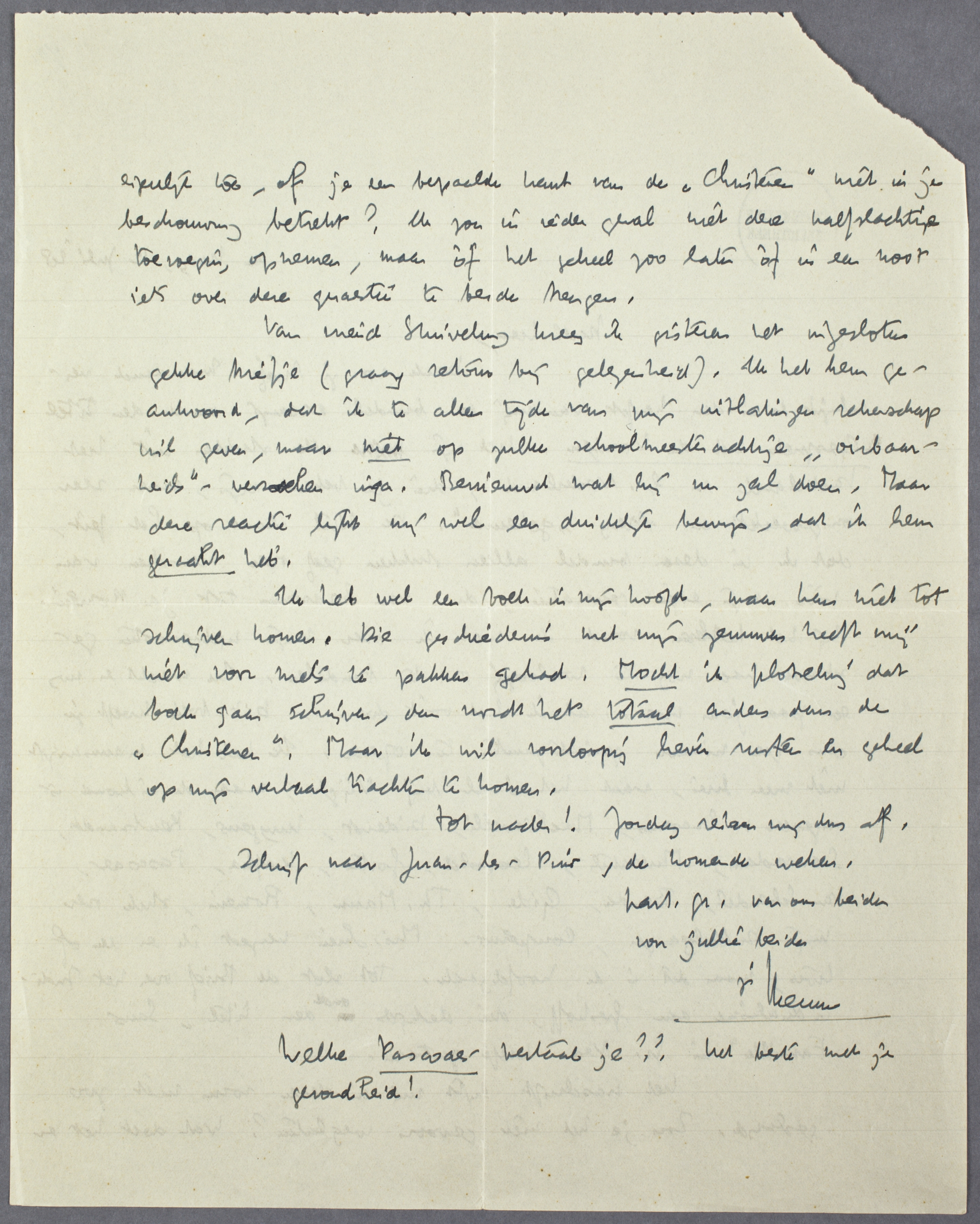 Het naschrift lijkt mij in dezen vorm niet zoo geslaagd. Zou je het niet gewoon weglaten? Wat doet het er eigenlijk toe, of je een bepaalde kant van de ‘Christenen’ niet in je beschouwing betrekt? Ik zou in ieder geval niet deze halfslachtige toevoeging opnemen, maar òf het geheel zoo laten òf in een noot iets over deze quaestie te berde brengen.