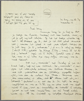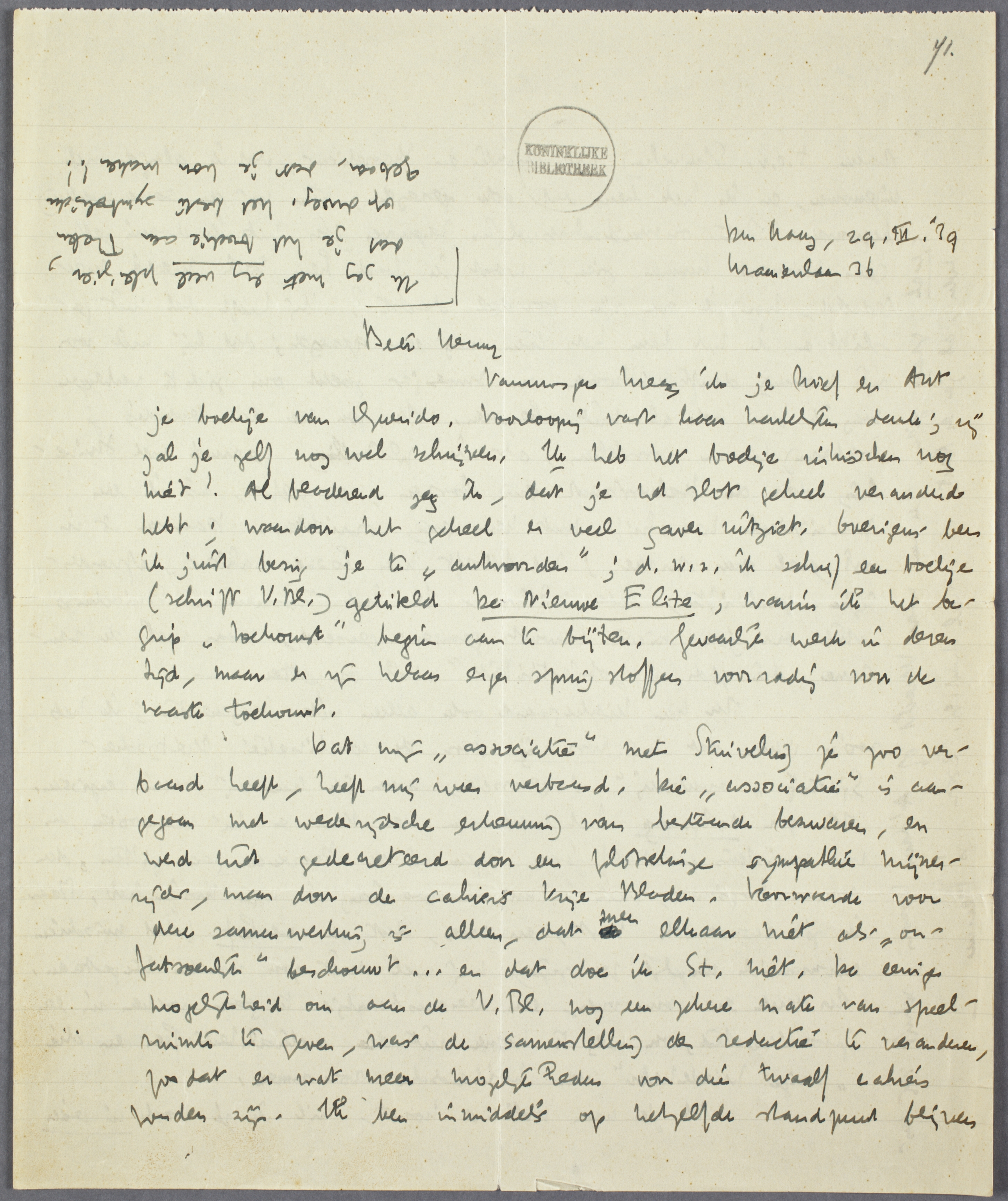 Vanmorgen kreeg ik je brief en Ant je boekje van Querido. Voorloopig vast haar hartelijken dank; zij zal je zelf nog wel schrijven. Ik heb het boekje intusschen nog niet! Al bladerend zag ik, dat je het slot geheel veranderd hebt; waardoor het geheel er veel gaver uitziet. Overigens ben ik juist bezig je te ‘antwoorden’; d.w.z. ik schrijf een boekje (schrift V.Bl.) getiteld De Nieuwe Elite, waarin ik het begrip ‘toekomst’ begin aan te bijten. Gevaarlijk werk in dezen tijd, maar er zijn helaas erger springstoffen voorradig voor de naaste toekomst.