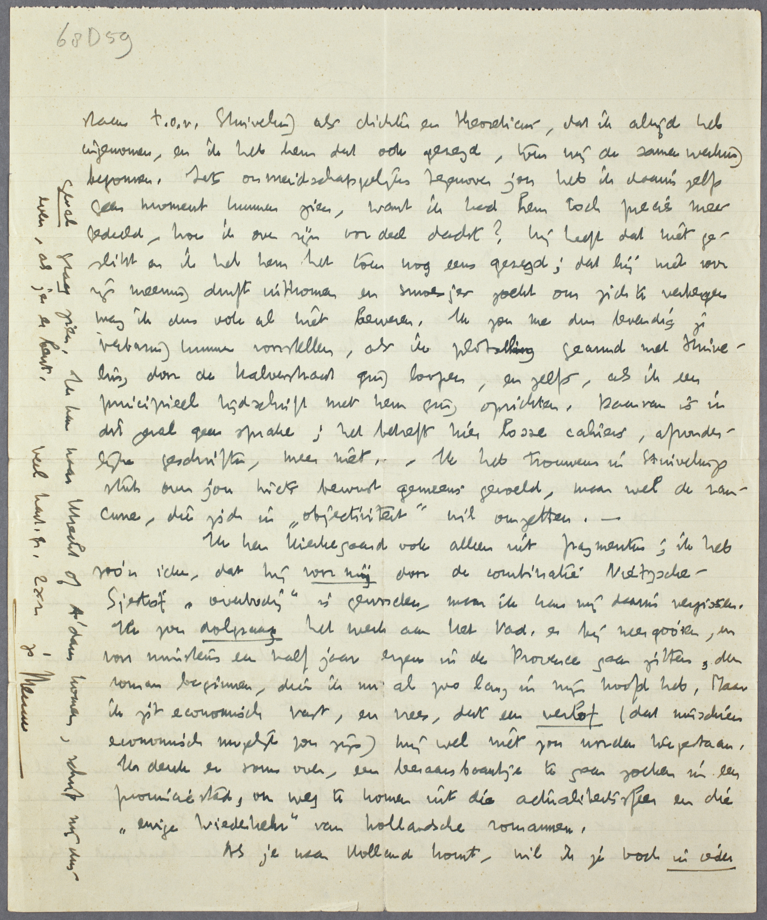 Ik ken Kierkegaard ook alleen uit fragmenten; ik heb zoo’n idee, dat hij voor mij door de combinatie Nietzsche-Sjestof ‘overbodig’ is geworden, maar ik kan mij daarin vergissen. Ik zou dolgraag het werk aan Het Vad. willen neergooien, en voor minstens een half jaar ergens in de Provence gaan zitten, den roman beginnen, dien ik nu al zoo lang in mijn hoofd heb. Maar ik zit economisch vast, en vrees, dat een verlof (dat misschien economisch mogelijk zou zijn) mij wel niet zou worden toegestaan. Ik denk er soms over, een leeraarsbaantje te gaan zoeken in een provinciestad, om weg te komen uit die actualiteitssfeer en die ‘ewige Wiederkehr’ van hollandsche romannen.