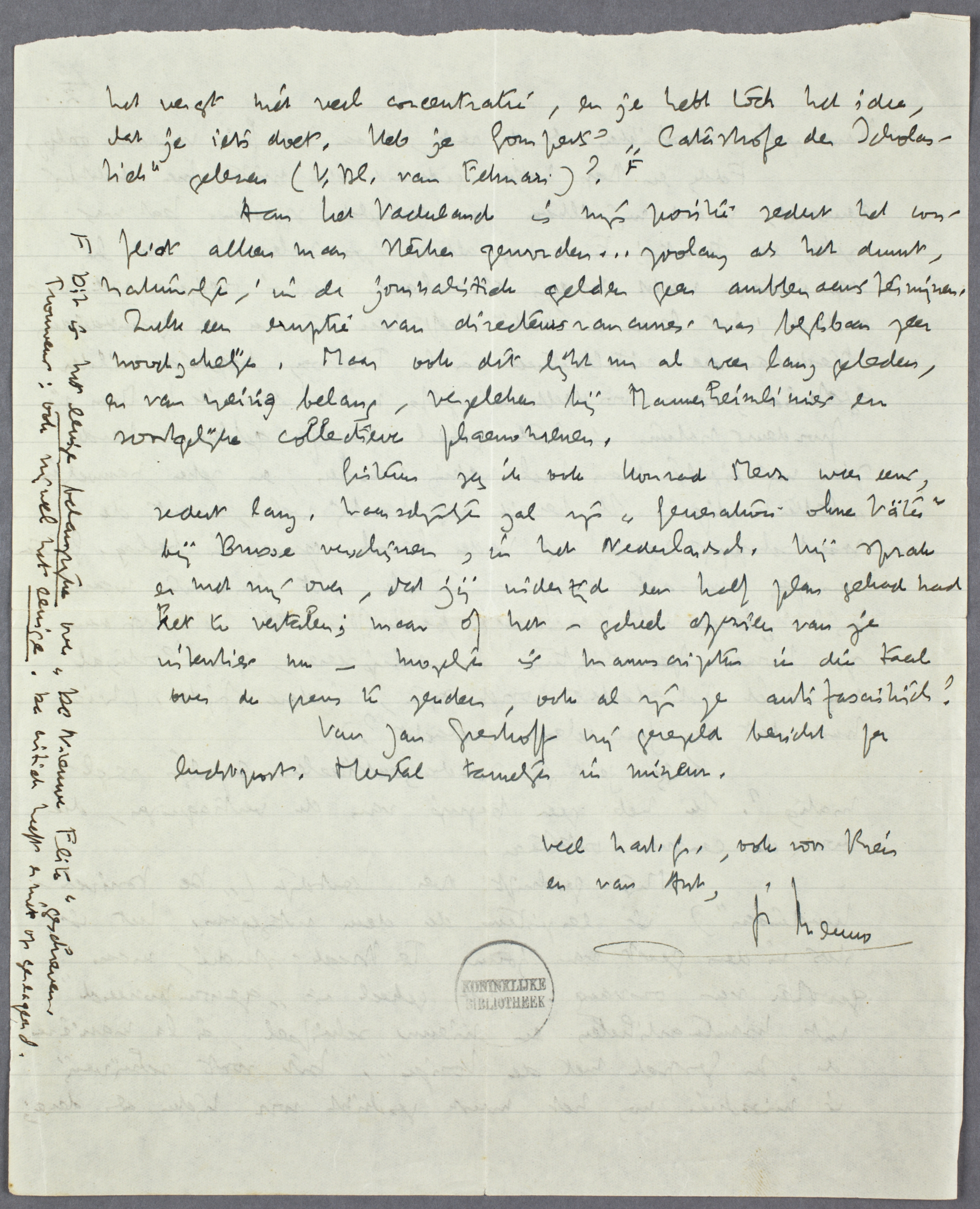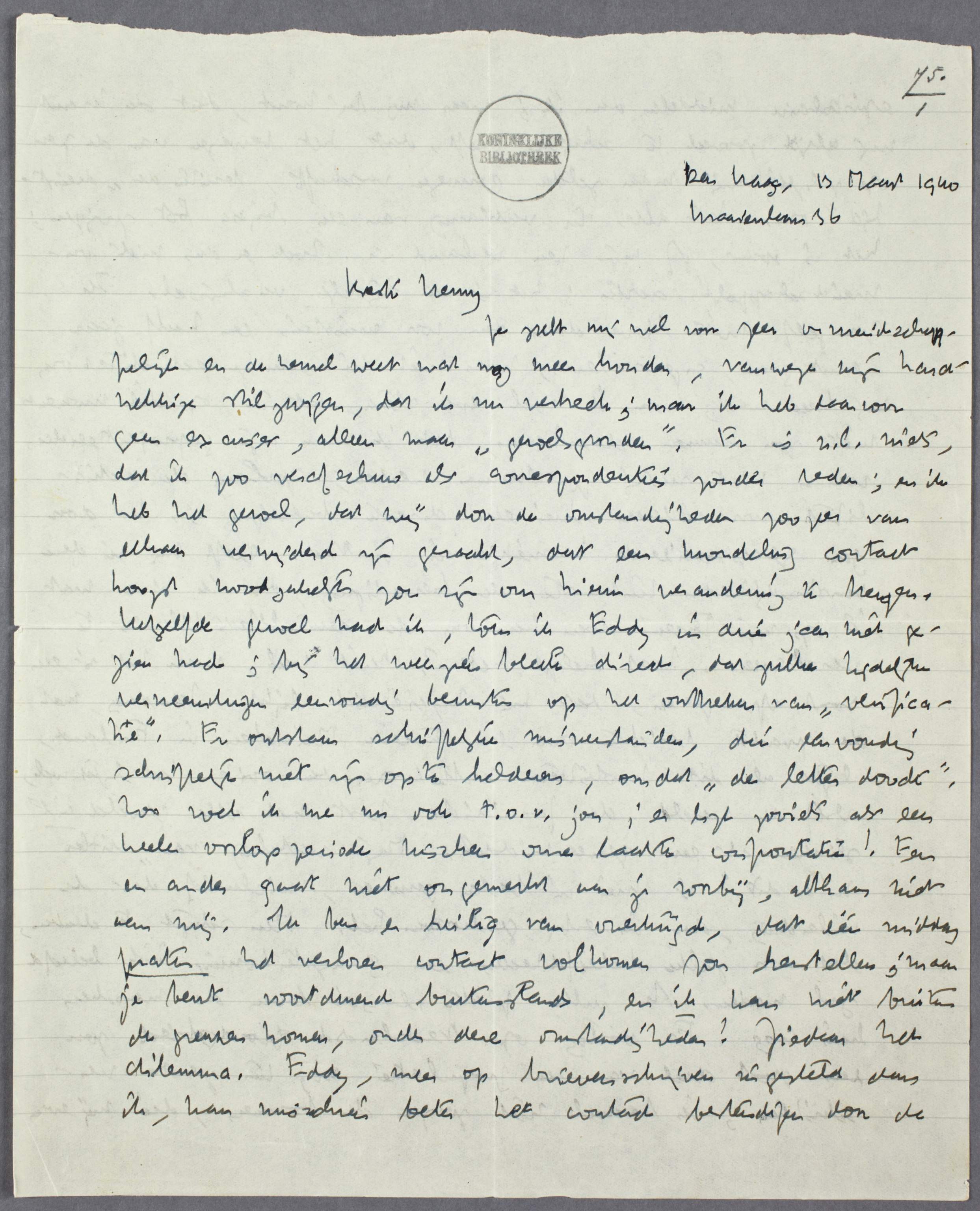 Gisteren zag ik Konrad Merz weer eens, sedert lang. Waarschijnlijk zal zijn ‘Generation ohne Väter’ bij Brusse verschijnen, in het Nederlandsch. Hij sprak er met mij over, dat jij indertijd een half plan gehad had het te vertalen; maar of het - geheel afgezien van je intenties nu - mogelijk is manuscripten in die taal over de grens te zenden, ook al zijn ze antifascistisch?