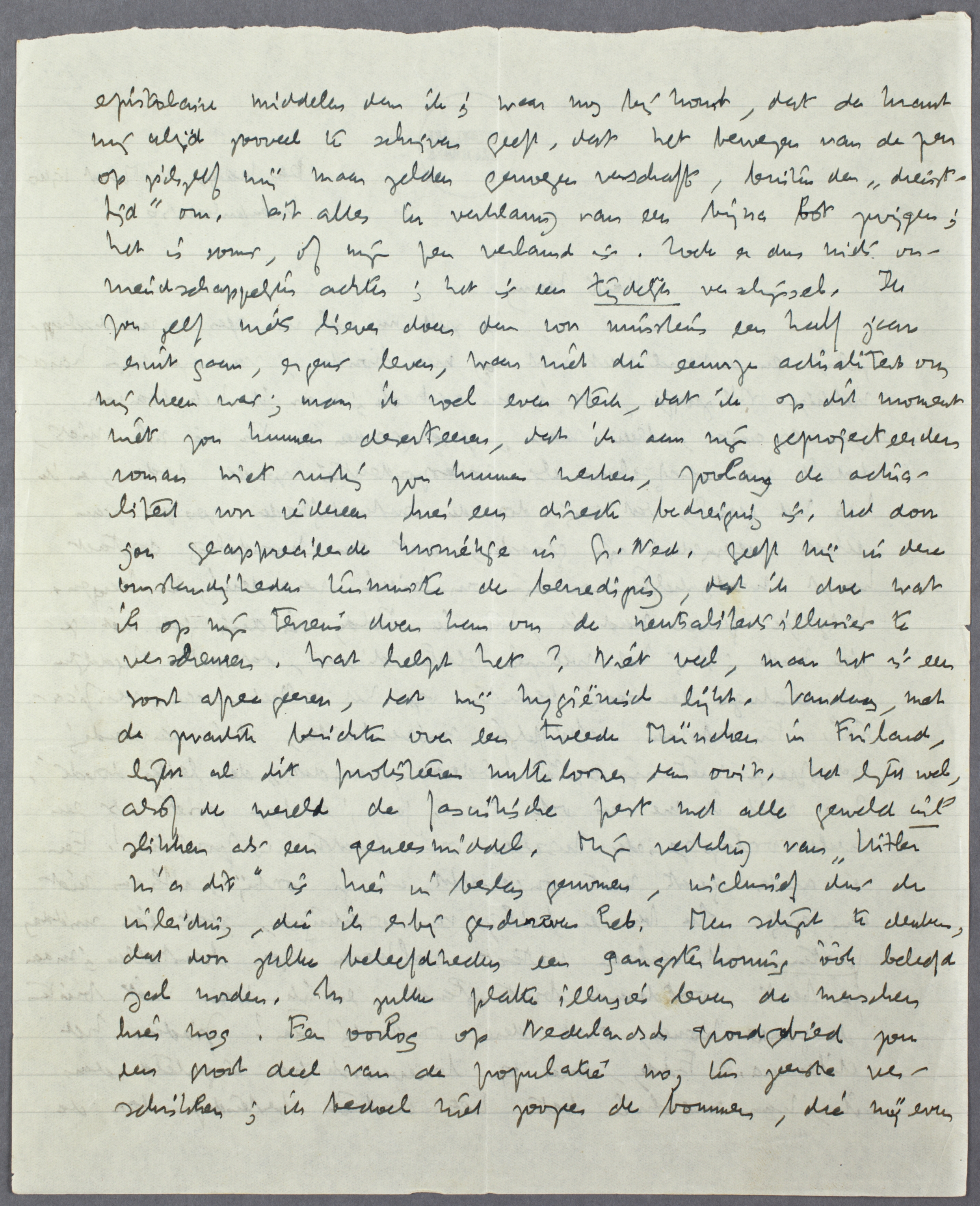 Je zult mij wel voor zeer onvriendschappelijk en de hemel weet wat nog meer houden, vanwege mijn hardnekkige stilzwijgen, dat ik nu verbreek; maar ik heb daarvoor geen excuses, alleen maar ‘gevoelsgronden’. Er is n.l. niets, dat ik zoo verafschuw als correspondentie zonder reden; en ik heb het gevoel, dat wij door de omstandigheden zoozeer van elkaar verwijderd zijn geraakt, dat een mondeling contact hoogst noodzakelijk zou zijn om hierin verandering te brengen. Hetzelfde gevoel had ik, toen ik Eddy in drie jaar niet gezien had; bij het weerzien bleek direct, dat zulke tijdelijke vervreemdingen berusten op het ontbreken van ‘verificatie’. Er ontstaan schriftelijke misverstanden, die eenvoudig schriftelijk niet zijn op te helderen, omdat ‘de letter doodt’. Zoo voel ik me nu ook t.o.v. jou; er ligt zooiets als een heele oorlogsperiode tusschen onze laatste confrontatie! Een en ander gaat niet onopgemerkt aan je voorbij, althans niet aan mij. Ik ben er heilig van overtuigd, dat één middag praten het verloren contact volkomen zou herstellen; maar je bent voortdurend buitenslands, en ik kan niet buiten de grenzen komen, onder deze omstandigheden! Ziedaar het dilemma. Eddy, meer op briefschrijven ingesteld dan ik, kan misschien beter het contact bestendigen door de epistolaire middelen dan ik; waar nog bij komt, dat de krant mij altijd zooveel te schrijven geeft, dat het bewegen van de pen op zichzelf mij maar zelden genoegen verschaft, buiten den ‘diensttijd’ om. Dit alles in verklaring van een bijna bot zwijgen; het is soms, of mijn pen verlamd is. Zoek er dus niets onvriendschappelijks achter; het is een tijdelijk verschijnsel. Ik zou zelf niets liever doen dan voor minstens een half jaar eruit gaan, ergens leven, waar niet altijd die eeuwige actualiteit om mij heen was; maar ik voel even sterk, dat ik op dit moment niet zou kunnen deserteeren, dat ik aan mijn geprojecteerden roman niet rustig zou kunnen werken, zoolang de actualiteit voor iedereen hier een directe bedreiging is. Het door jou geapprecieerde kroniekje in Gr.Ned. geeft mij in deze omstandigheden tenminste de bevrediging, dat ik doe wat ik op mijn terrein doen kan om de neutraliteitsillusie te verscheuren. Wat helpt het? Niet veel, maar het is een soort afreageeren, dat mij hygiënisch lijkt. Vandaag, met de zwartste berichten over een tweede München in Finland, lijkt al dit protesteeren nutteloozer dan ooit. Het lijkt wel, alsof de wereld de fascistische pest wil slikken als een geneesmiddel. Mijn vertaling van ‘Hitler m'a dit’ is hier in beslag genomen, inclusief dus de inleiding, die ik erbij geschreven heb. Men schijnt te denken, dat door zulke beleefdheden een gangsterkoning óók beleefd zal worden. In zulke platte illusies leven de menschen hier nog. Een oorlog op Nederlandsch grondgebied zou een groot deel van de populatie nog ten zeerste verschrikken; ik bedoel niet zoozeer de bommen, die mij even hard zullen verschrikken als de rest, maar het feit van den oorlog.