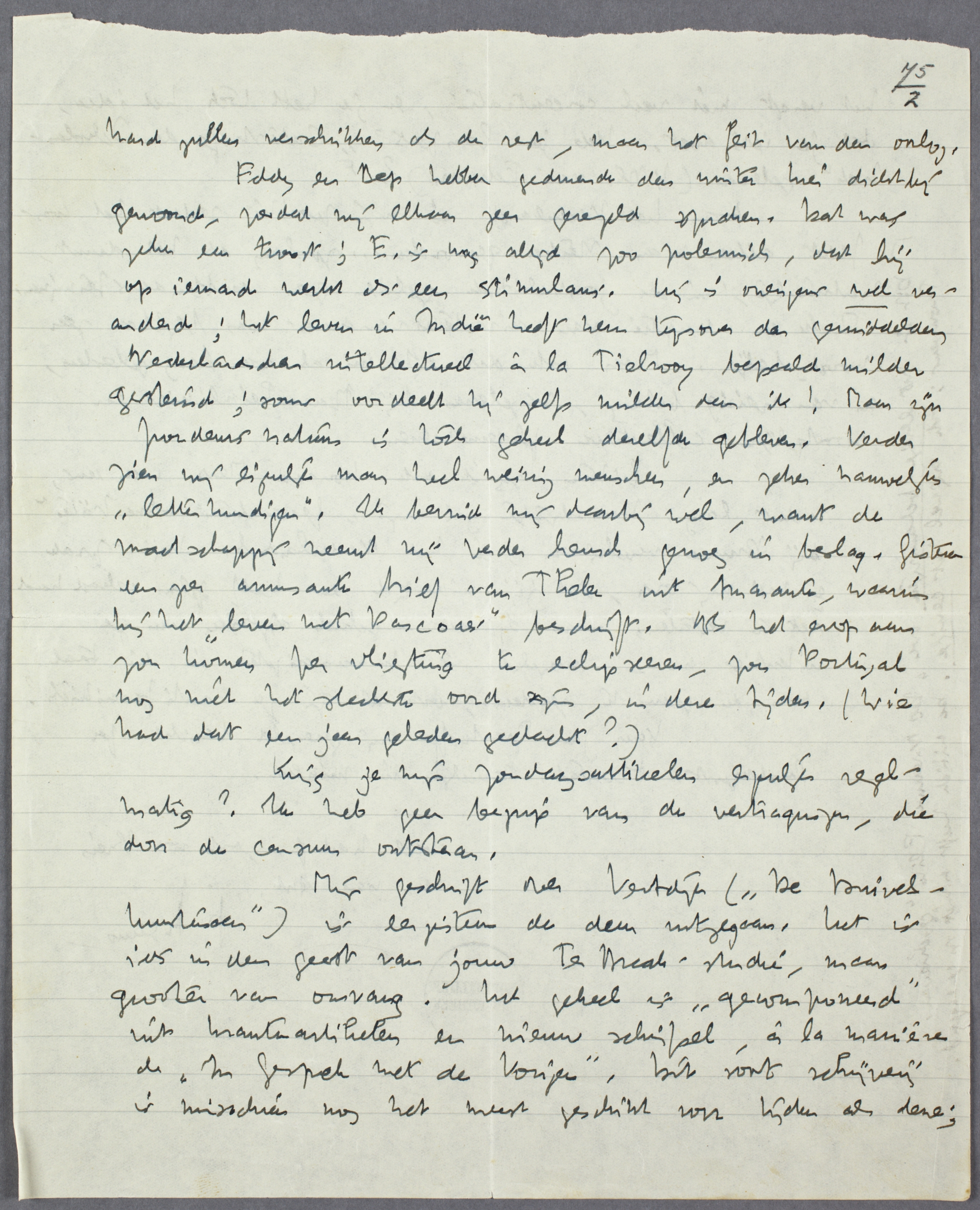 Eddy en Bep hebben gedurende den winter hier dichtbij gewoond, zoodat wij elkaar zeer geregeld spraken. Dat was zeker een troost; E. is nog altijd zoo polemisch, dat hij op iemand werkt als een stimulans. Hij is overigens wel veranderd; het leven in Indië heeft hem tegenover den gemiddelden Nederlandschen intellectueel à la Tielrooy bepaald milder gestemd; soms oordeelt hij zelfs milder dan ik! Maar zijn frondeurs natuur is toch geheel dezelfde gebleven. Verder zien wij natuurlijk maar heel weinig menschen, en zeker nauwelijks ‘letterkundigen’. Ik bevind mij daarbij wel, want de maatschappij neemt mij verder heusch genoeg in beslag. Gisteren een zeer amusante brief van Thelen uit Amarante, waarin hij het ‘leven met Pascoaes’ beschrijft. Als het erop aan zou komen per vliegtuig te eclipseeren, zou Portugal nog niet het slechtste oord zijn, in deze tijden. (Wie had dat een jaar geleden gedacht?)