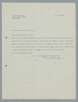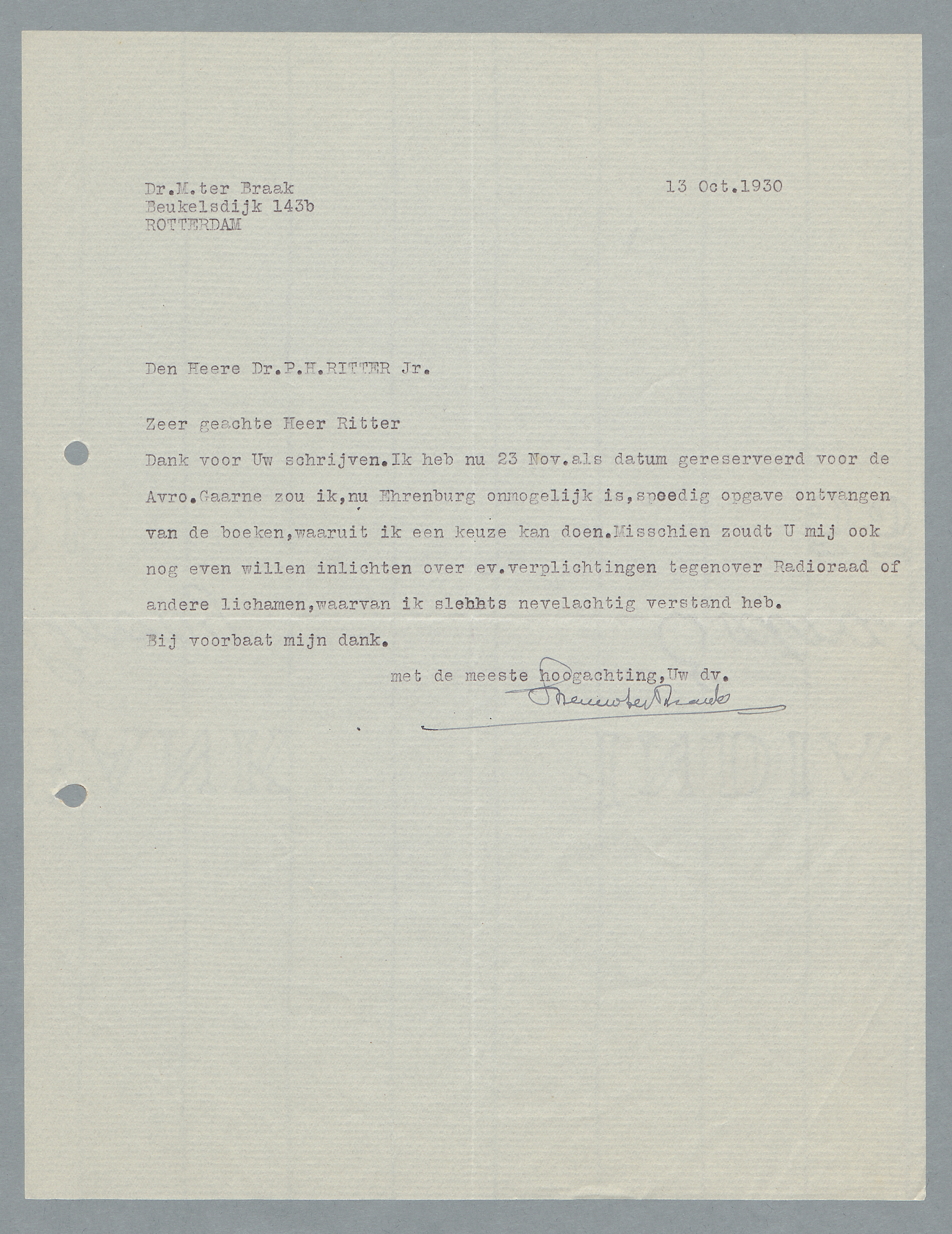 Dank voor Uw schrijven. Ik heb nu 23 Nov. als datum gereserveerd voor de Avro. Gaarne zou ik, nu Ehrenburg onmogelijk is, spoedig opgave ontvangen van de boeken, waaruit ik een keuze kan doen. Misschien zoudt U mij ook nog even willen inlichten over ev. verplichtingen tegenover Radioraad of andere lichamen, waarvan ik slechts nevelachtig verstand heb.