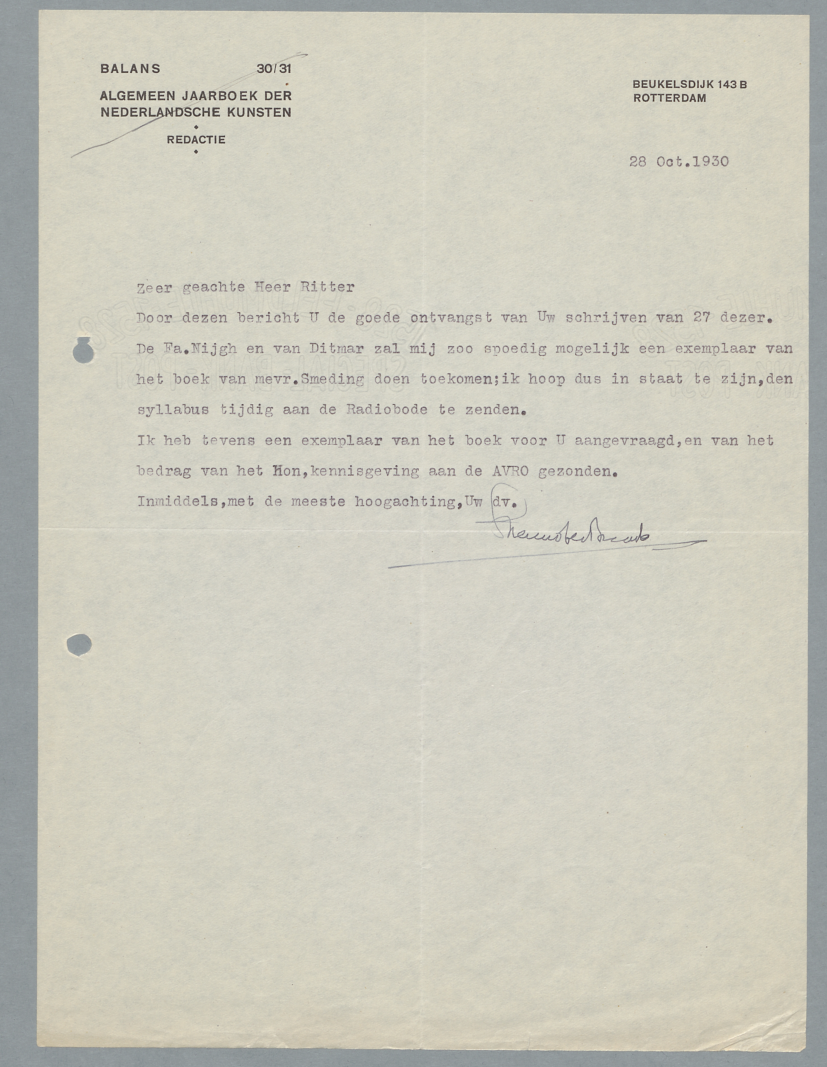 De Fa. Nijgh & van Ditmar zal mij zoo spoedig mogelijk een exemplaar van het boek van mevr. Smeding doen toekomen; ik hoop dus in staat te zijn, den syllabus tijdig aan de Radiobode te zenden.