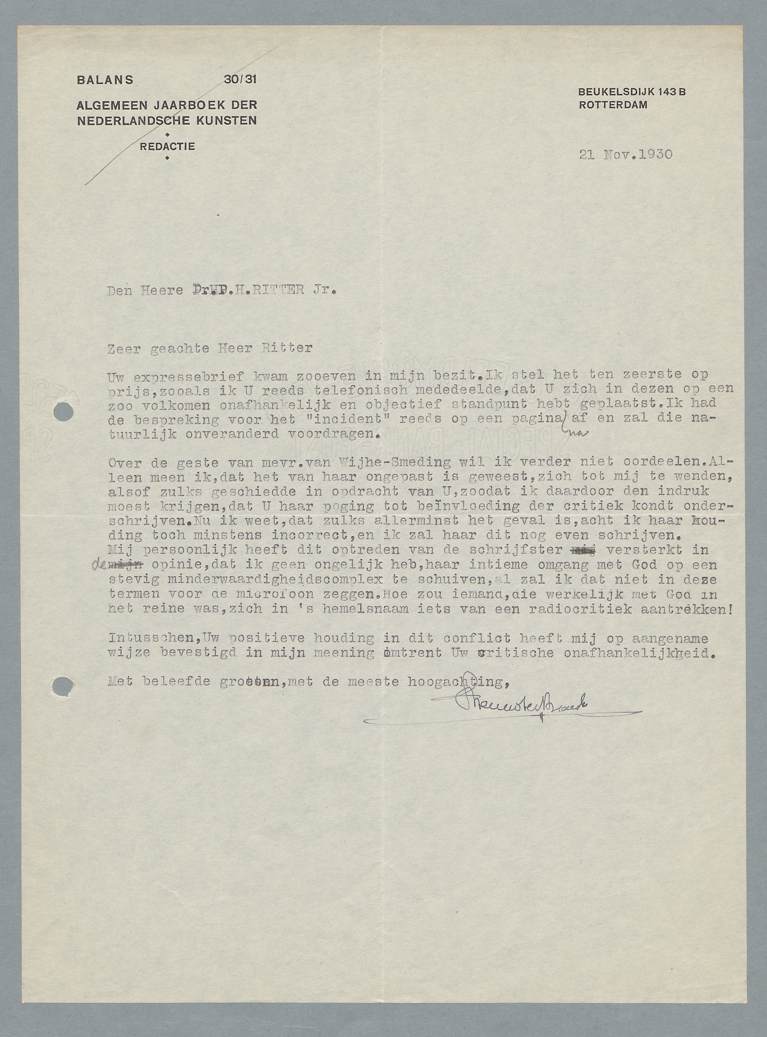 Over de geste van mevr. Wijhe-Smeding wil ik verder niet oordelen. Alleen meen ik, dat het van haar ongepast is geweest, zich tot mij te wenden, alsof zulks geschiedde in opdracht van U, zoodat ik daardoor den indruk moest krijgen, dat U haar poging tot beïnvloeding der critiek kondt onderschrijven. Nu ik weet, dat zulks allerminst het geval is, acht ik haar houding toch minstens incorrect, en ik zal haar dit nog even schrijven.
