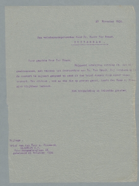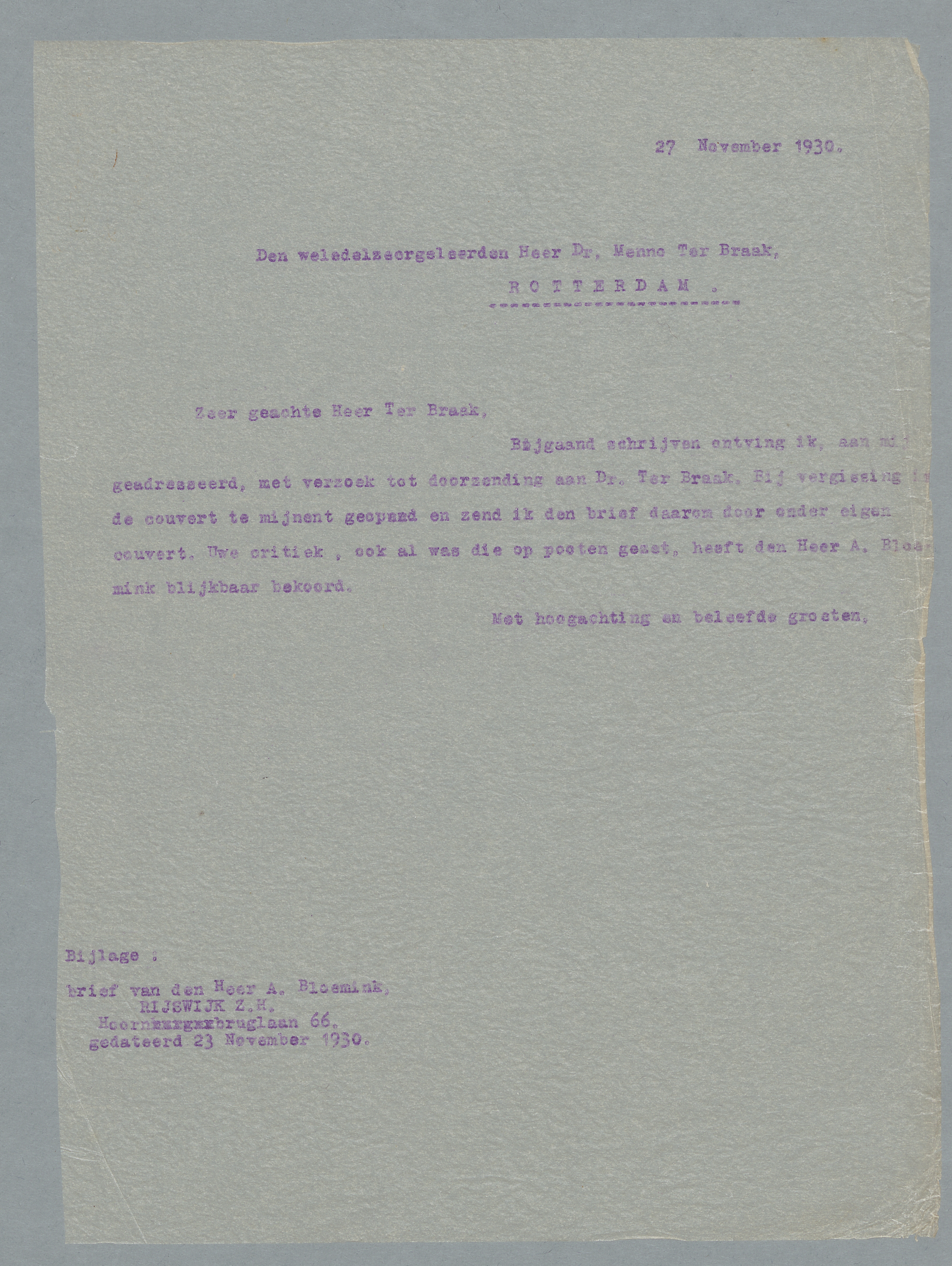 Bijgaand schrijven ontving ik aan mij geadresseerd, met het verzoek tot doorzending aan Dr. Ter Braak. Bij vergissing de couvert te mijnent geopend en zend ik den brief daarom door onder eigen couvert. Uwe critiek, ook al was die op pooten gezet, heeft den Heer A. Bloemink blijkbaar bekoord.