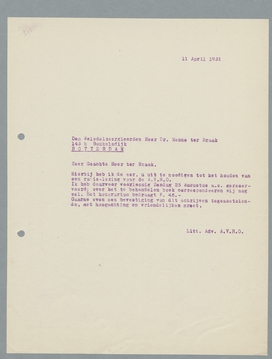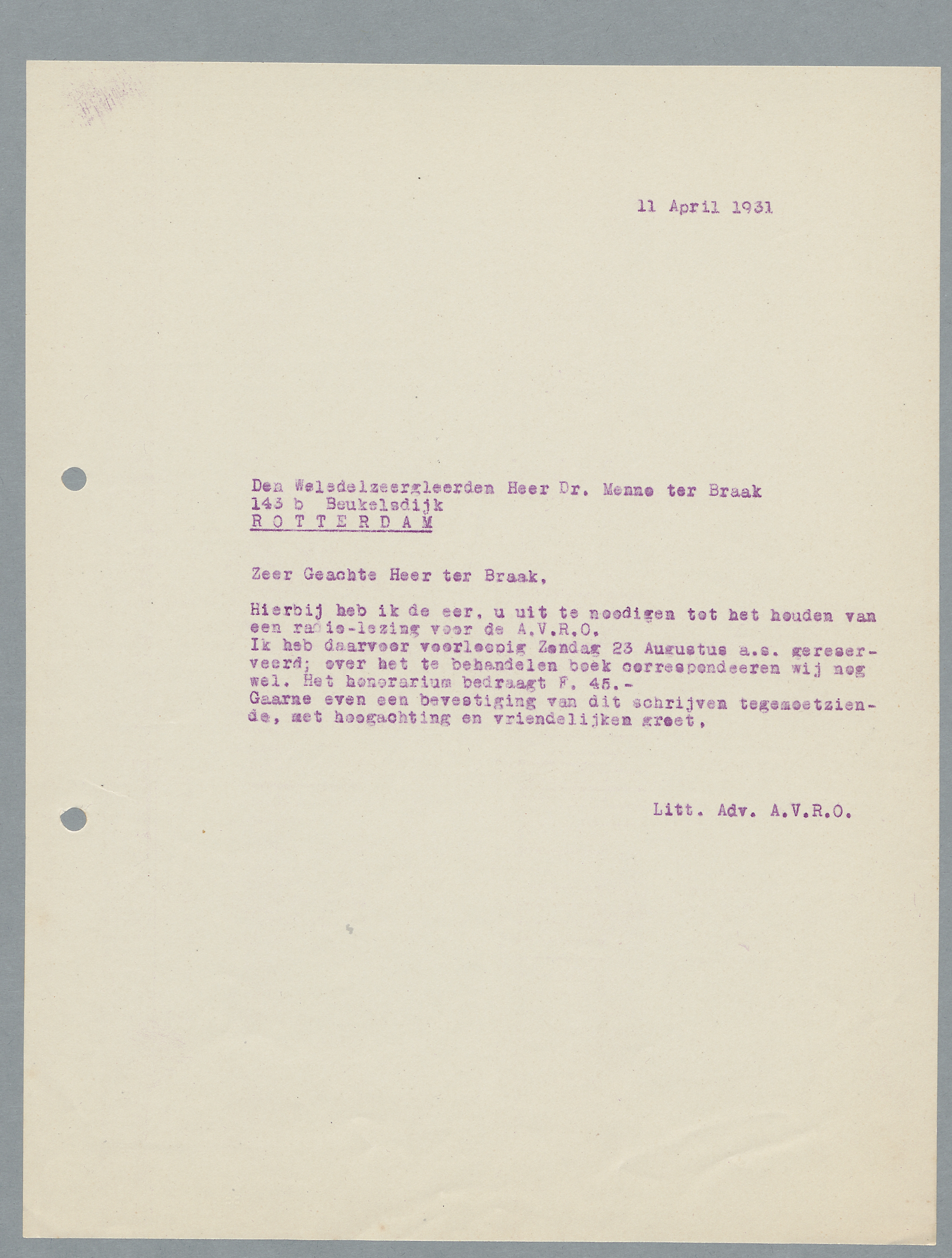 Hierbij heb ik de eer, U uit te noodigen tot het houden van een radio-lezing voor de A.V.R.O.