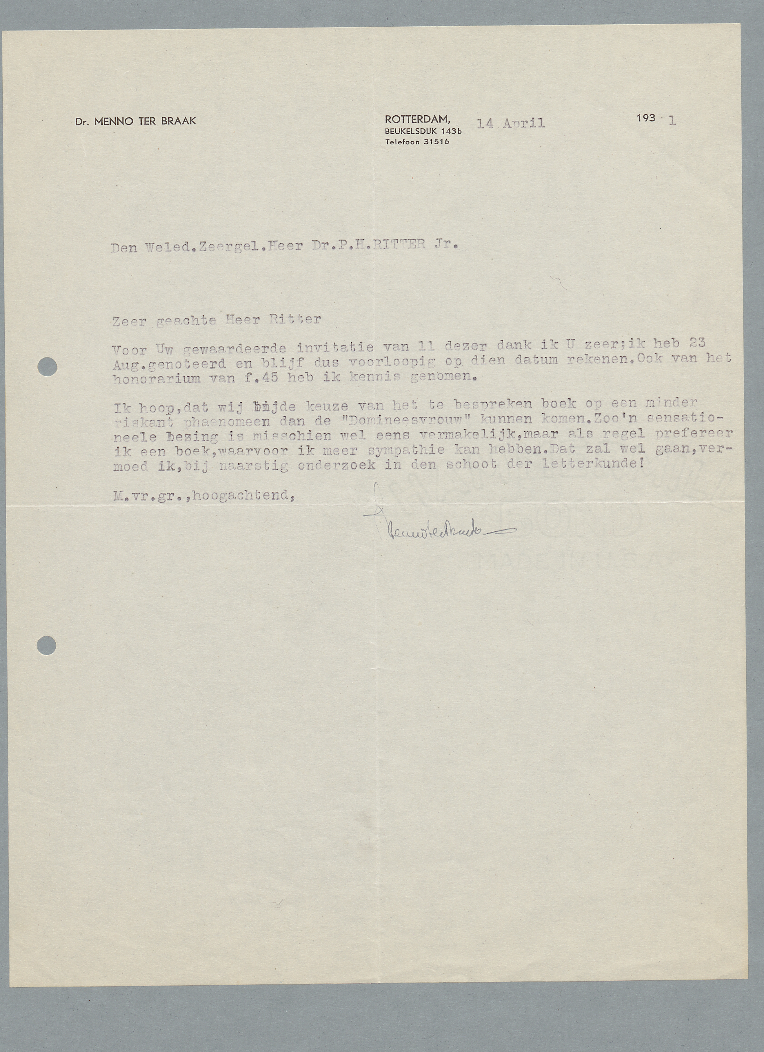 Voor Uw gewaardeerde invitatie van 11 dezer dank ik U zeer; ik heb 23 Aug. genoteerd en blijf dus voorloopig op dien datum rekenen. Ook van het honorarium van f.45 heb ik kennis genomen.