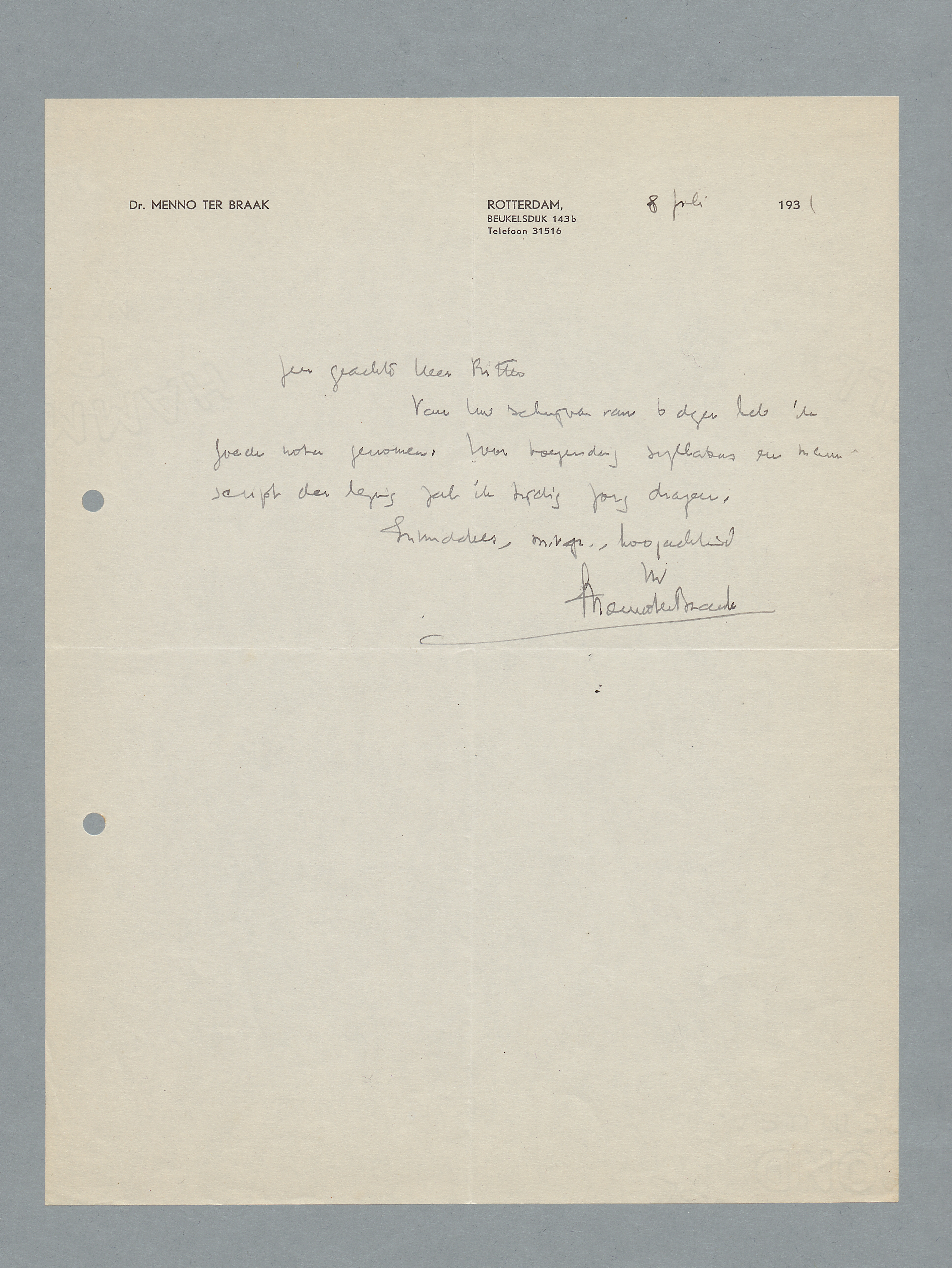 Van Uw schrijven van 6 dezer heb ik goede nota genomen. Voor toezending syllabus en manuscript der lezing zal ik tijdig zorg dragen.