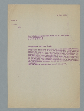 Zoudt u er iets voor gevoelen, om op uw aanstaand boekenhalfuurtje voor de A.V.R.O. te behandelen:’Point counter Point’ van Huxley? Zoo ja, dan hoor ik dat graag even per omgaande van u; ik stel veel prijs op een bespreking van dit boek voor onzen microphoon; het is ook een boek, dat in het centrum der belangstelling staat op het oogenblik en ik zou het heel prettig vinden, als u bereid was, het te behandelen. Den aanschaffingsprijs wilt u dan misschien wel in rekening brengen; ik zal uw honorarium dan daarmee verhoogen.
