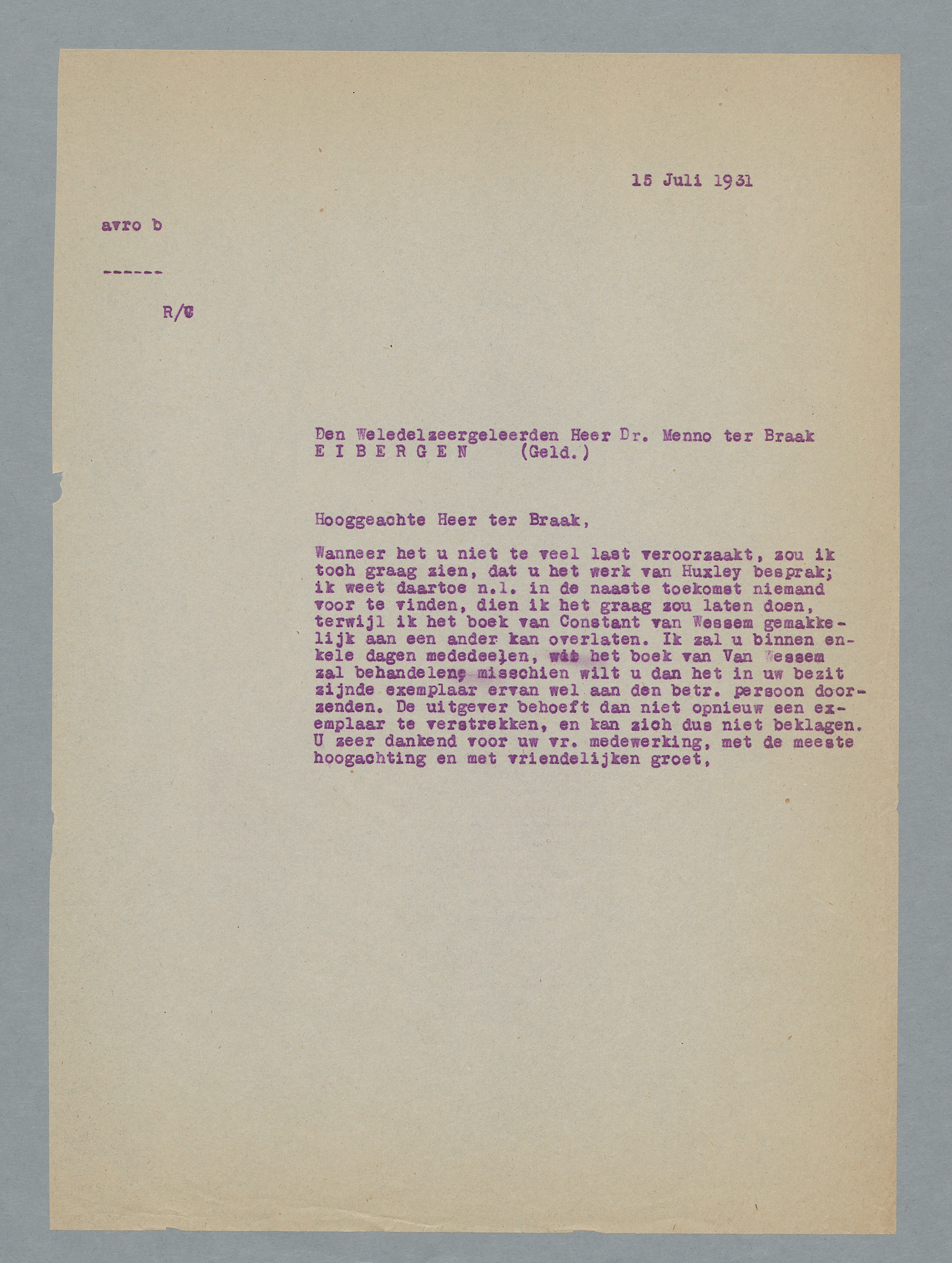 Wanneer het u niet te veel last veroorzaakt, zou ik toch graag zien, dat U het werk van Huxley besprak; ik weet daartoe n.l. in de naaste toekomst niemand voor te vinden, dien ik het graag zou laten doen, terwijl ik het boek van Constant van Wessem gemakkelijk aan een ander kan overlaten. Ik zal u binnen enkele dagen mededeelen, wie het boek van Van Wessem zal behandelen, misschien wilt u dan het in uw bezit zijnde exemplaar ervan wel aan de betr. persoon doorzenden. De uitgever behoeft dan niet opnieuw een exemplaar te verstrekken, en kan zich dus niet beklagen.