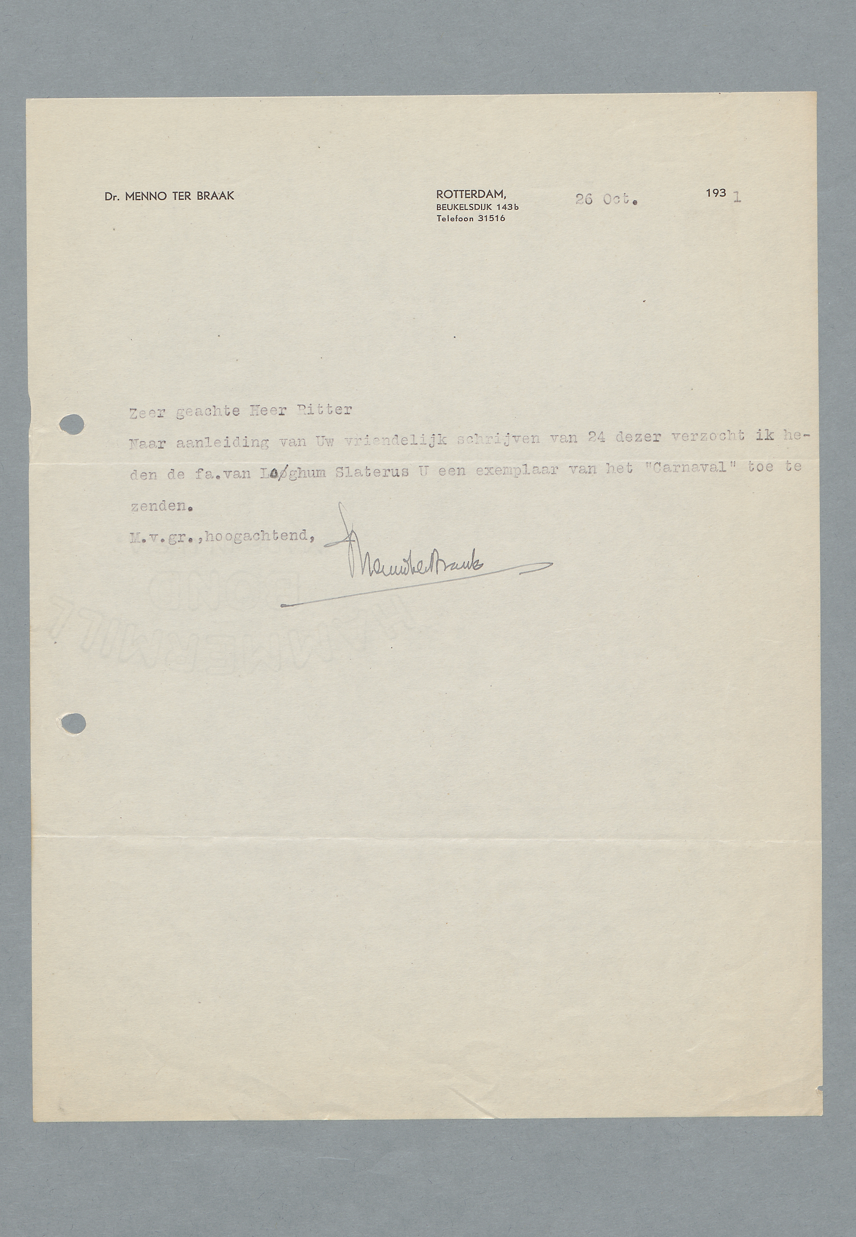 Naar aanleiding van Uw vriendelijk schrijven van 24 dezer verzocht ik heden de fa. van Loghum Slaterus U een exemplaar van het ‘Carnaval’ toe te zenden.