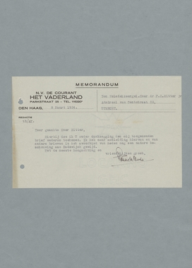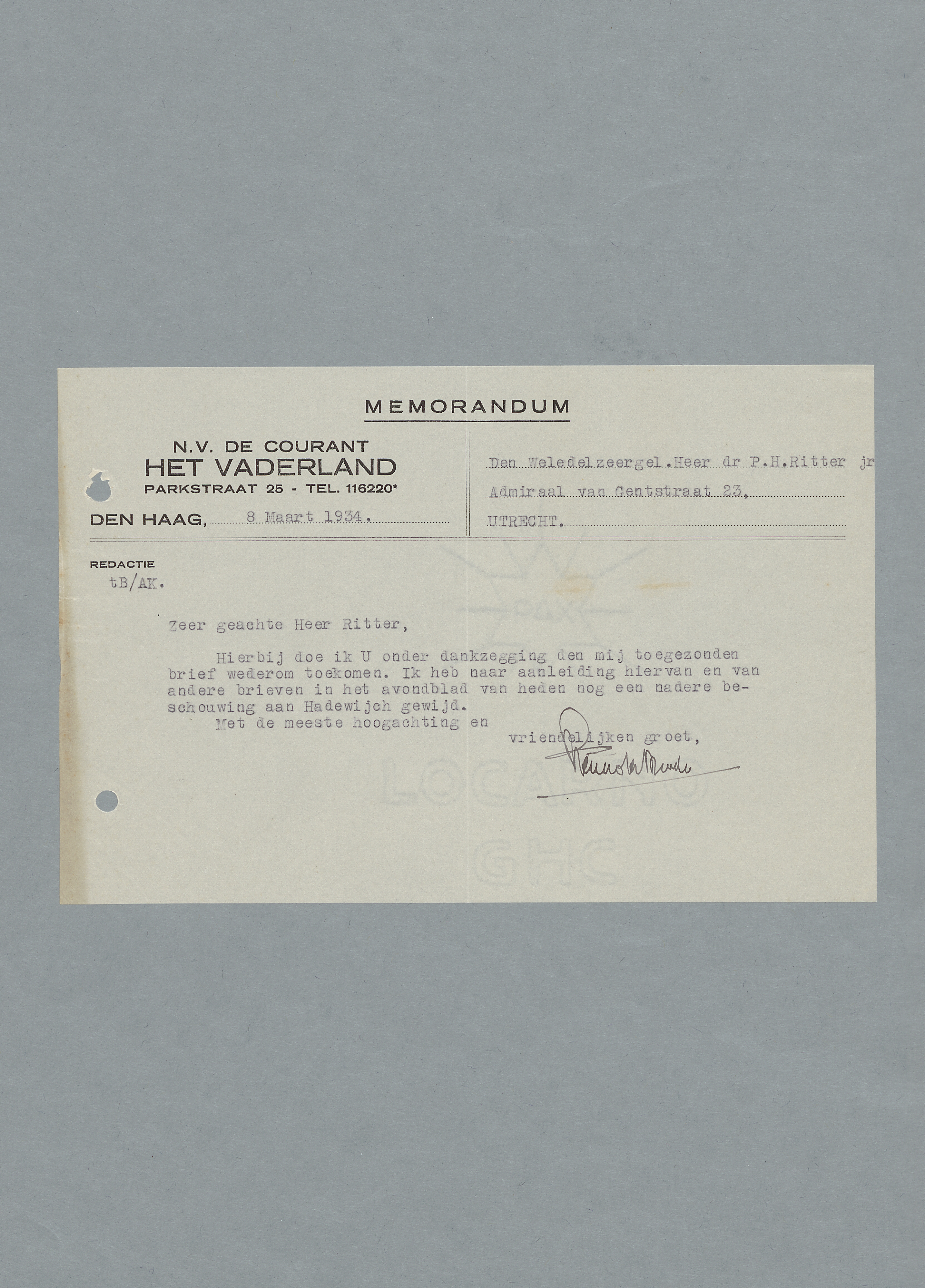 Hierbij doe ik U onder dankzegging den mij toegezonden brief wederom toekomen. Ik heb naar aanleiding hiervan en van andere brieven in het avondblad van heden nog geen nadere beschouwing aan Hadewijch gewijd.