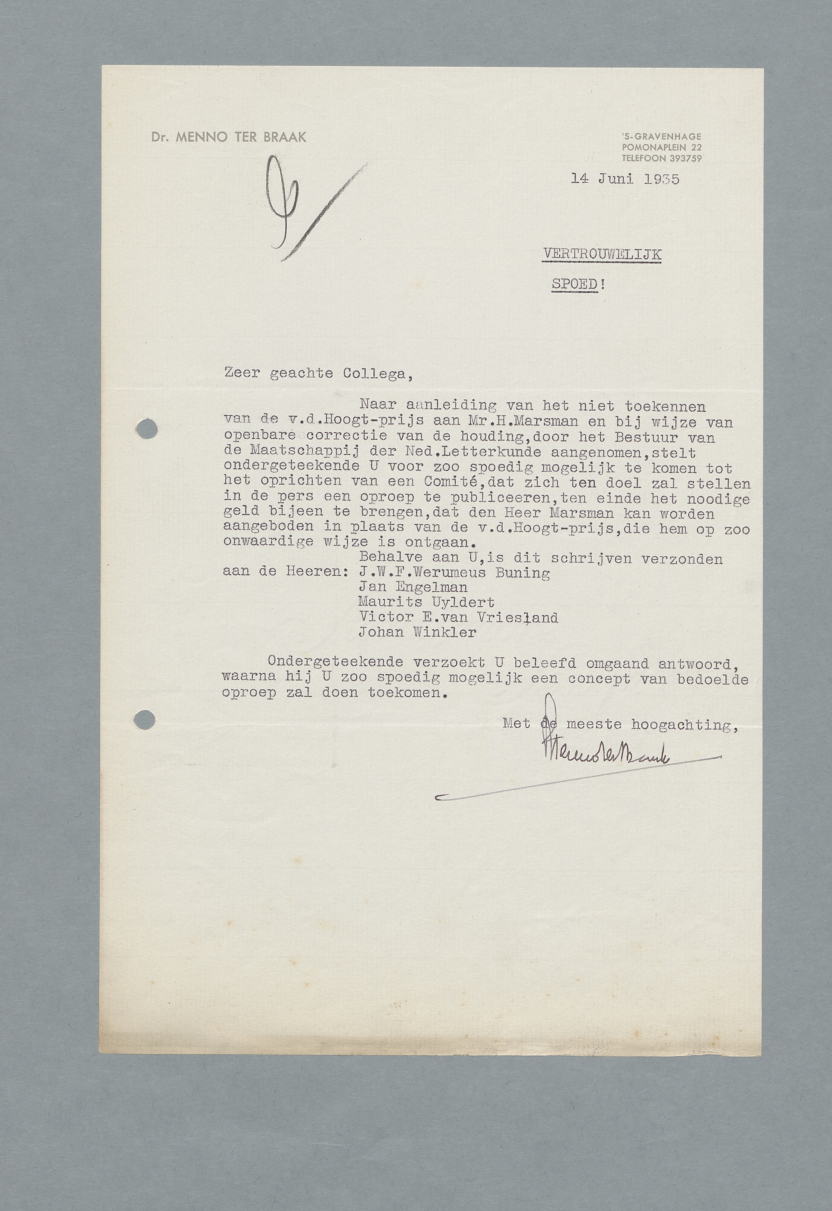 Naar aanleiding van het niet toekennen van de v.d.Hoogt-prijs aan Mr. H. Marsman en bij wijze van openbare correctie van de houding, door het Bestuur van de Maatschappij der Ned. Letterkunde aangenomen, stelt ondergeteekende U voor zoo spoedig mogelijk te komen tot het oprichten van een Comité, dat zich ten doel zal stellen in de pers een oproep te publiceeren, ten einde het noodige geld bijeen te brengen, dat den Heer Marsman kan worden aangeboden in plaats van de v.d.Hoogt-prijs, die hem op zoo onwaardige wijze is ontgaan.